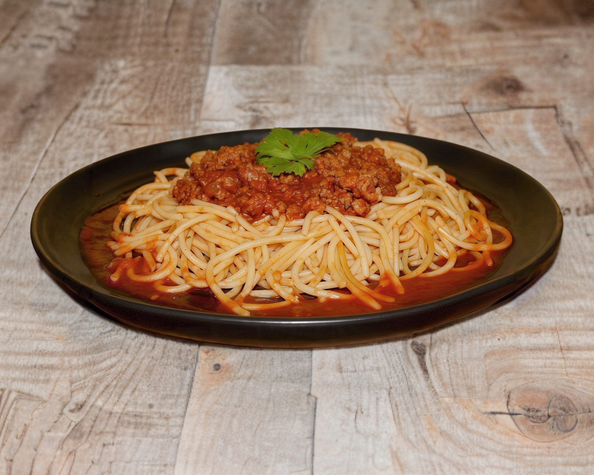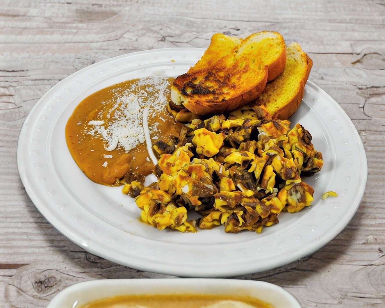Pimiento rojo o chipotle, vegetales salteados, puré de papa y arroz.