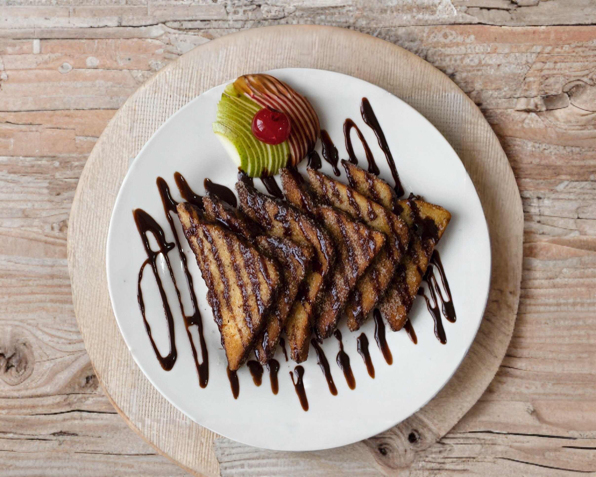 Por dentro tocino y pollo, pepino, philadelphia y aguacate, por fuera queso gratinado.