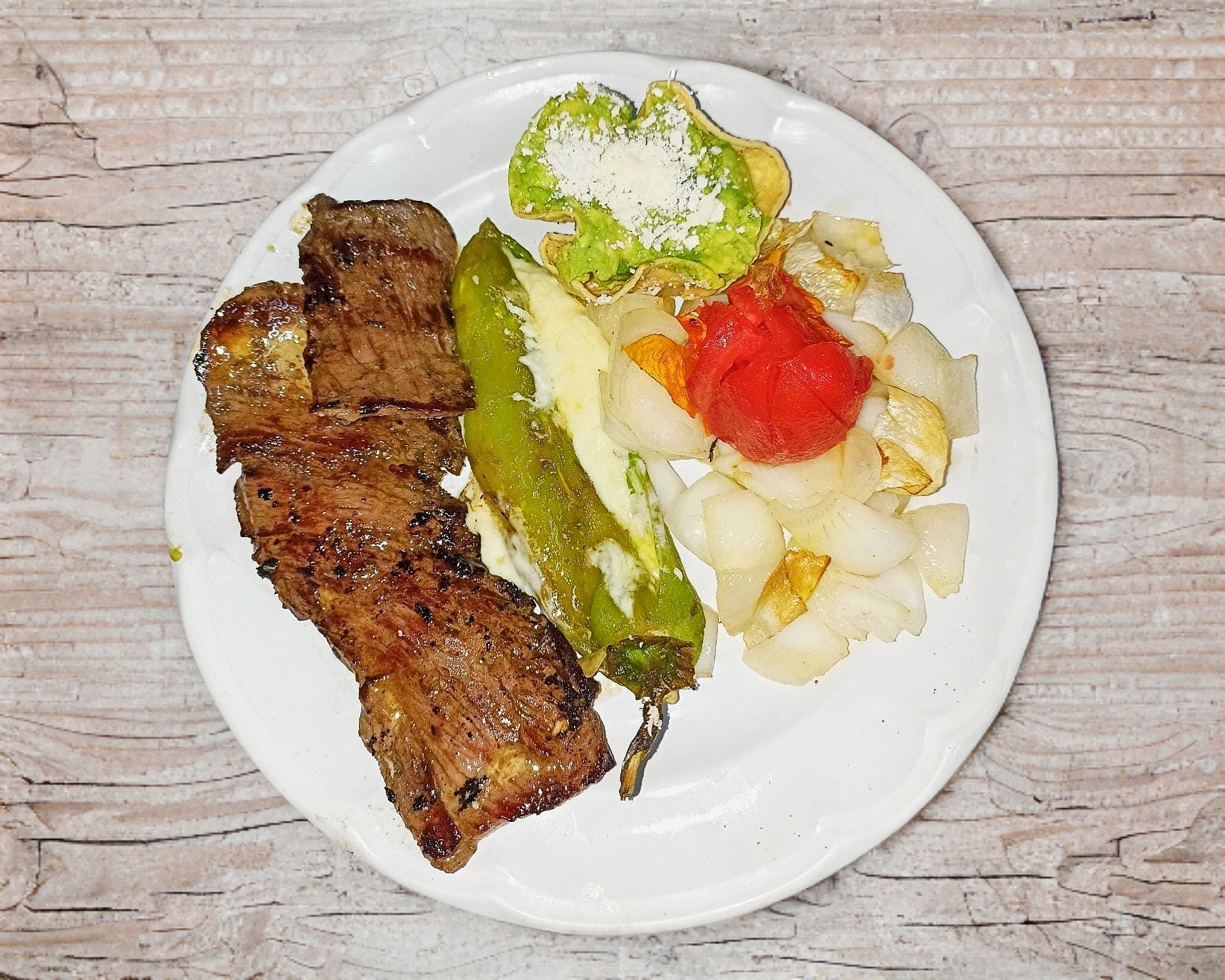Arrachera, chile relleno de queso, guacamole tomate y cebolla asada.