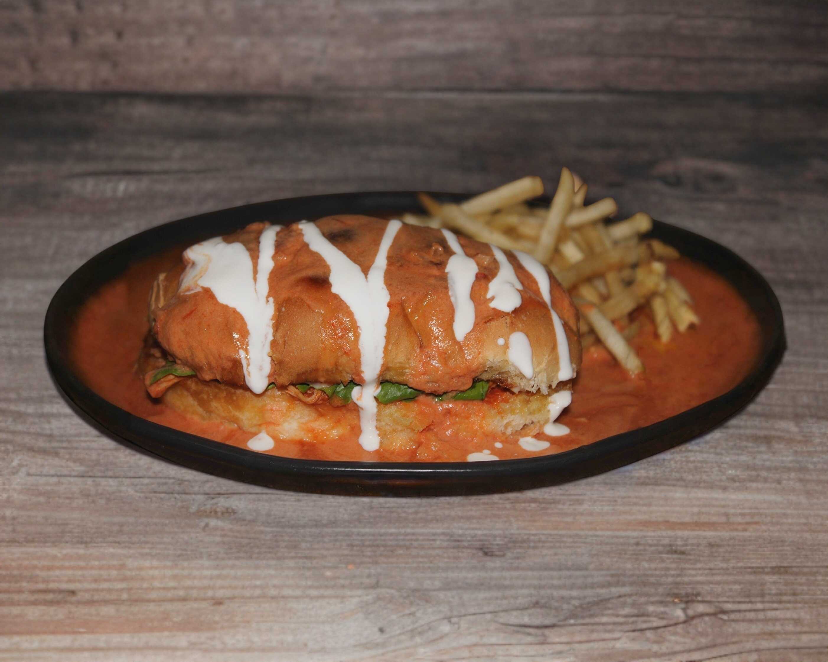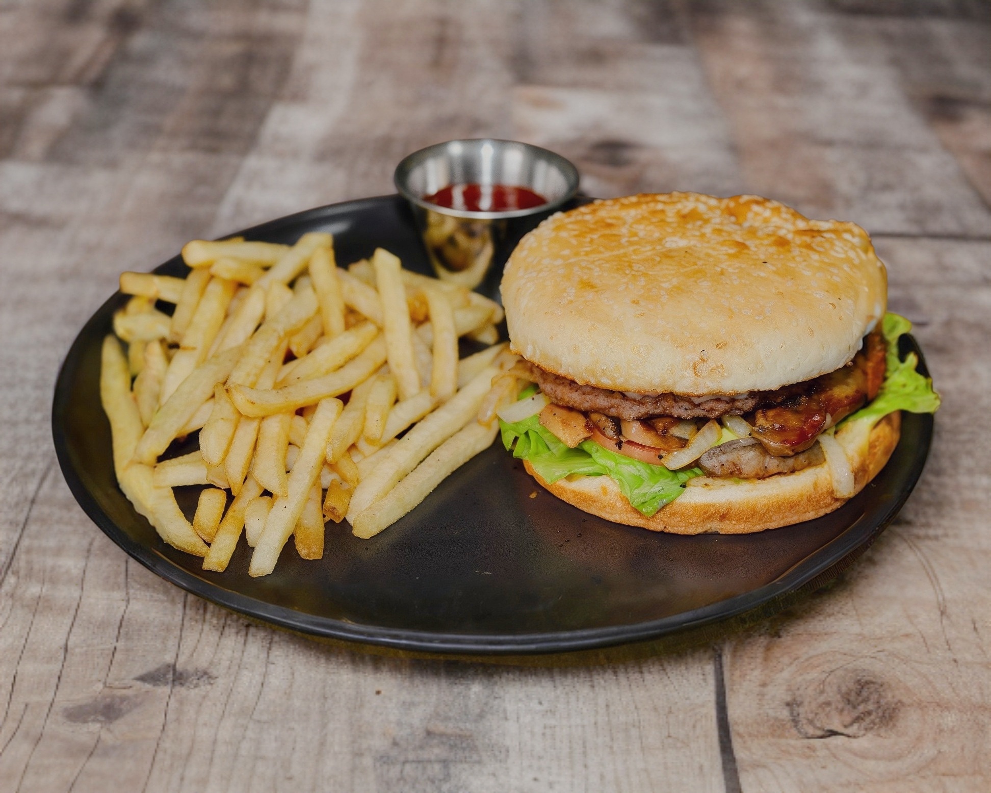 Hamburguesa de pollo empanizado, lechuga, tomate, jamón, queso y tocino.