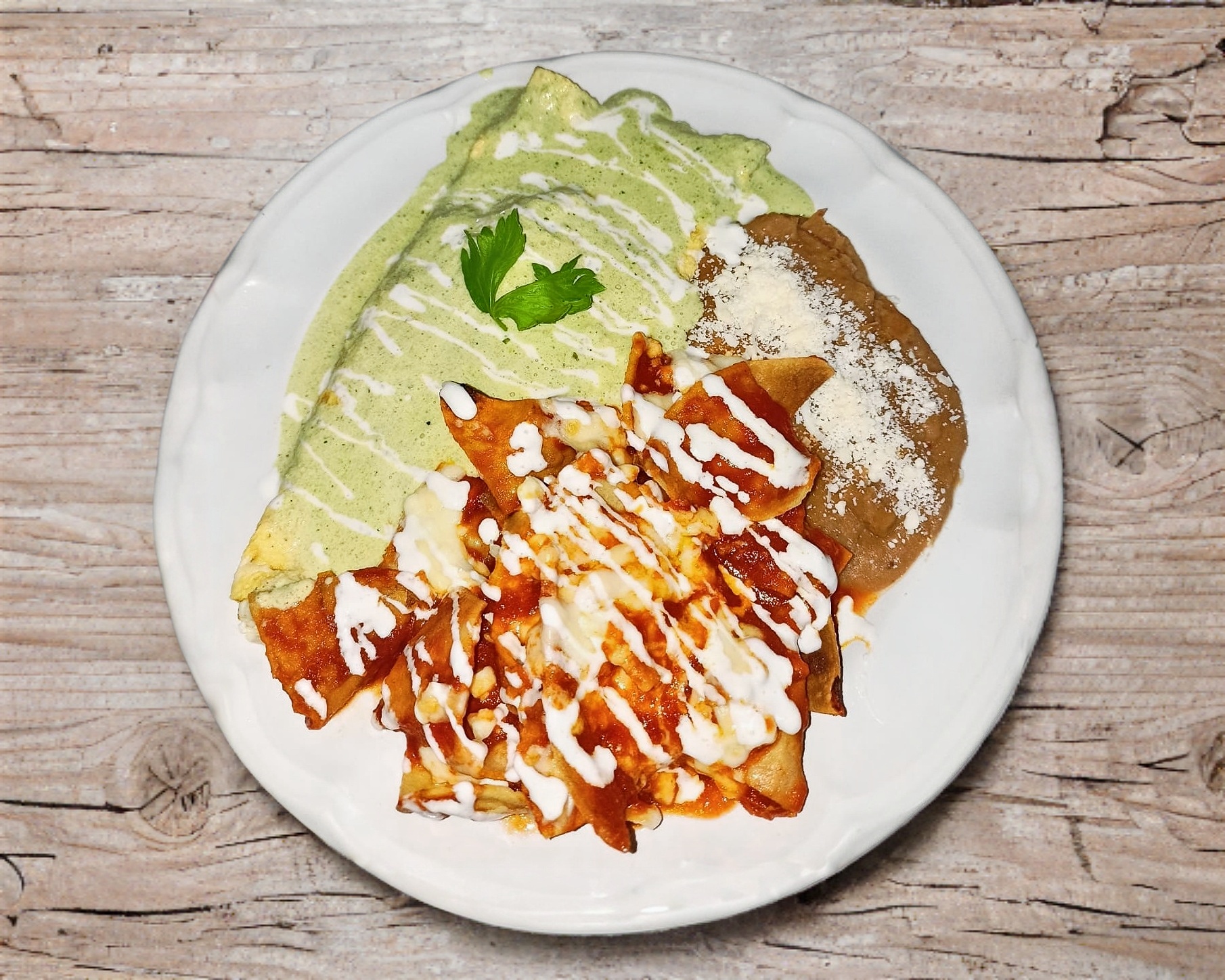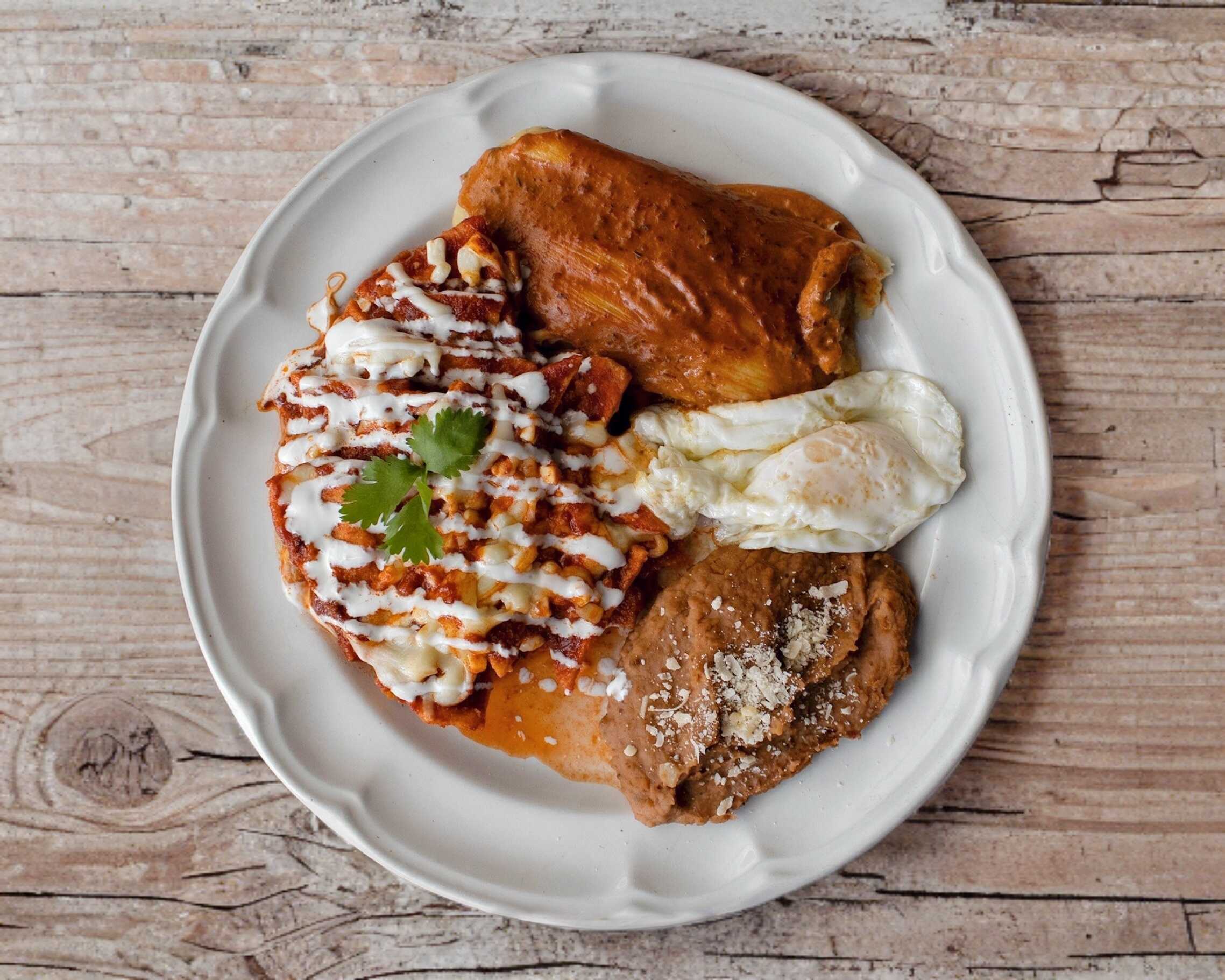 (Para una persona) Tamal, chilaquiles, huevo y frijoles.