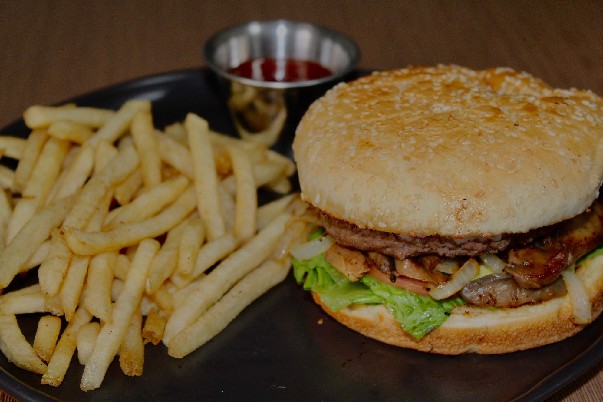 Hamburguesa de res, guacamole, tocino, cebolla con champiñones, queso, jamón, lechuga, tomate y pepinillos.