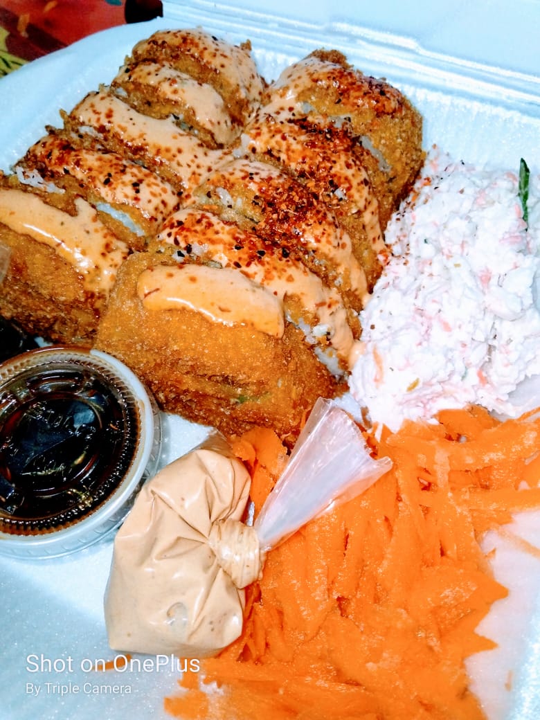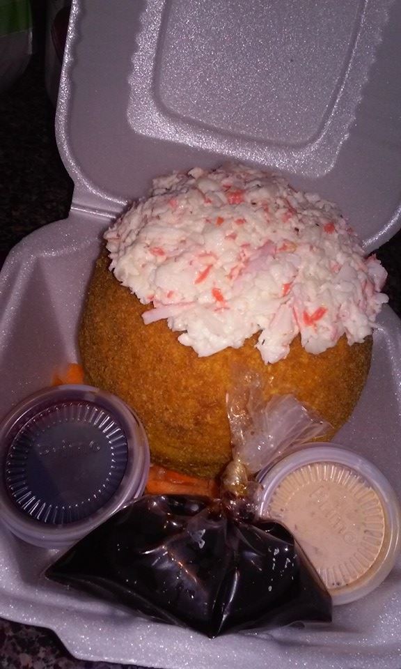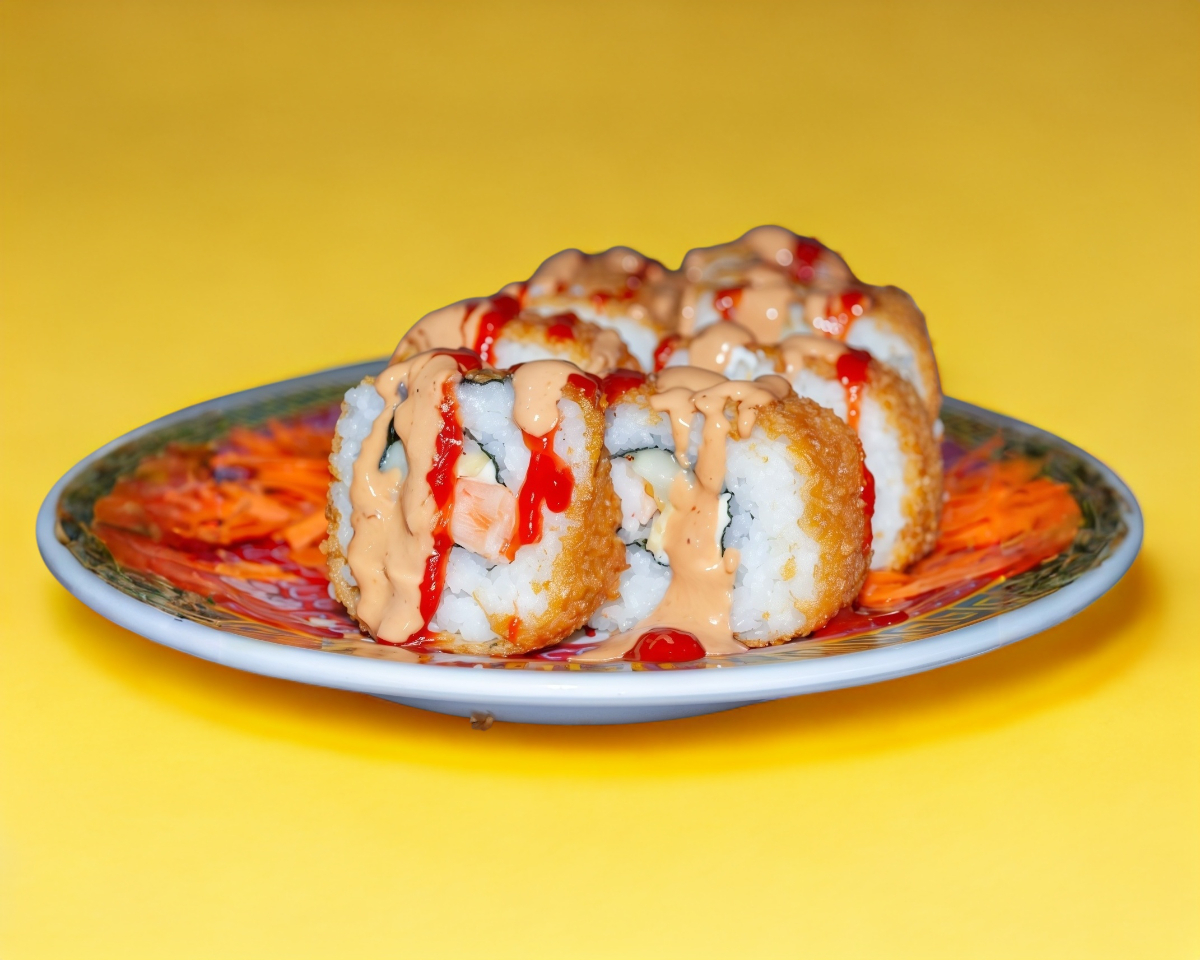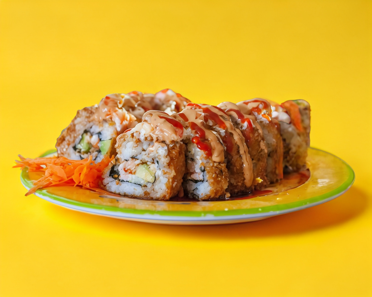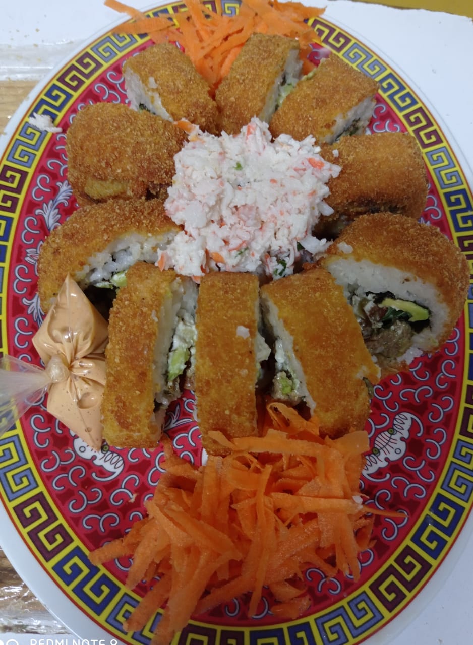 Philadelphia, pepino, aguacate, camarón y salsa volcano encima