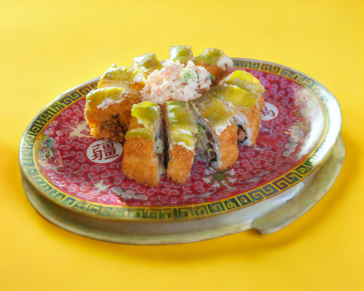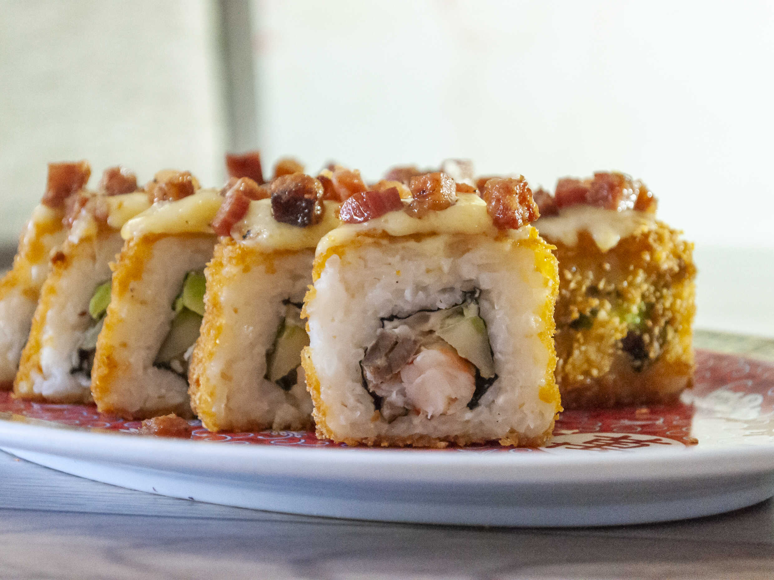 Philadelphia, pepino, aguacate, res, camarón y tocino adentro. Queso gratinado y tocino por fuera