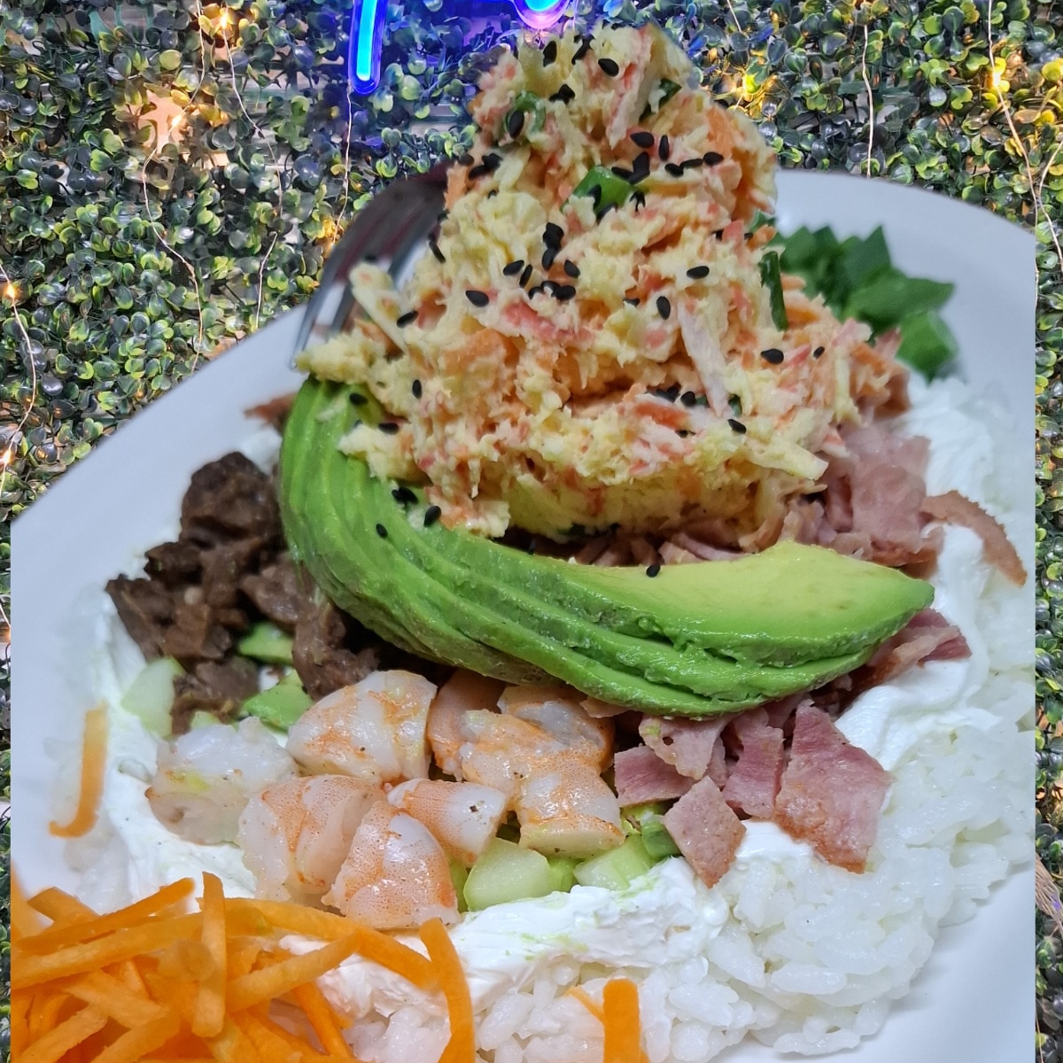 bola de arroz con aguacate, pepino, philadelphia, camarón y tampico
