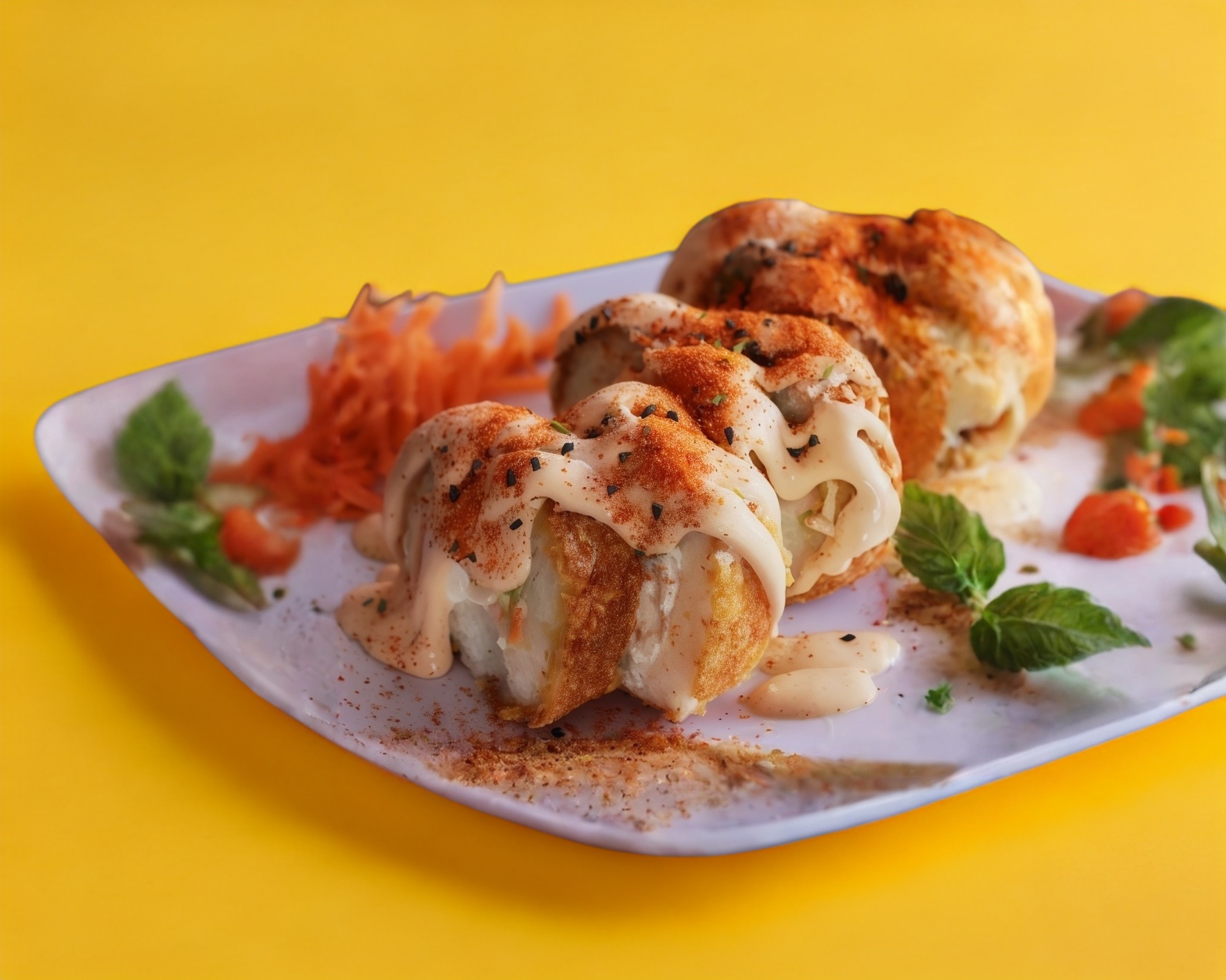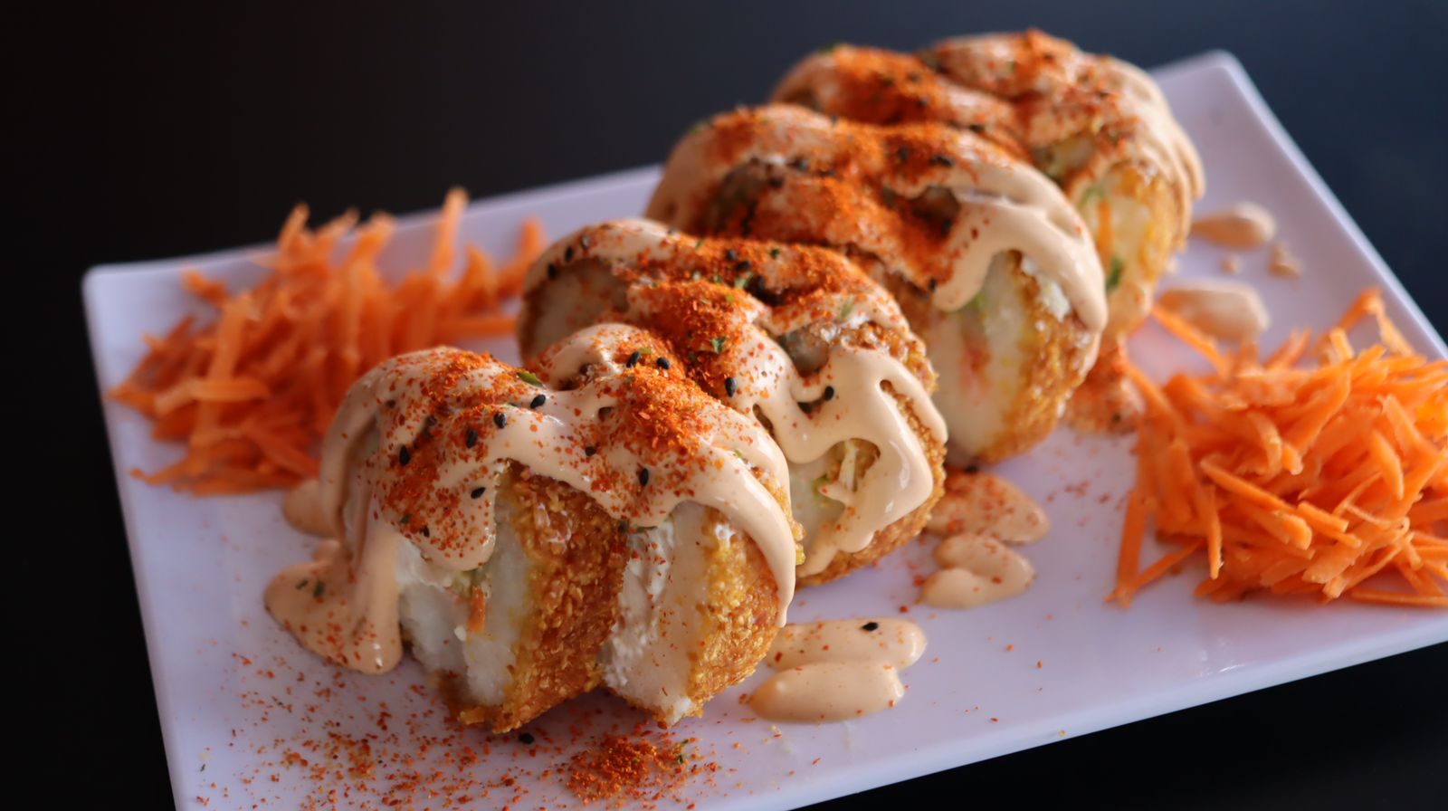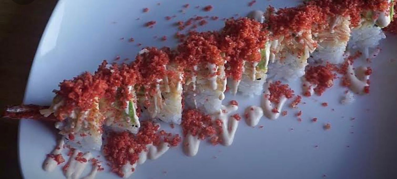 Philadelphia, aguacate y camarón, por fuera aderezo chipotle bañado en shichimi togarashi.