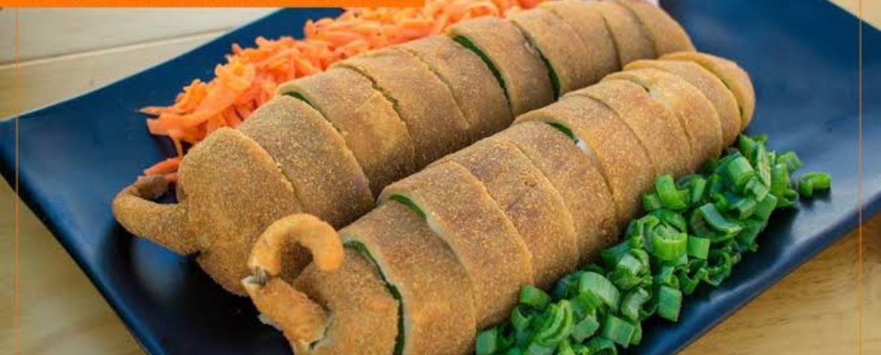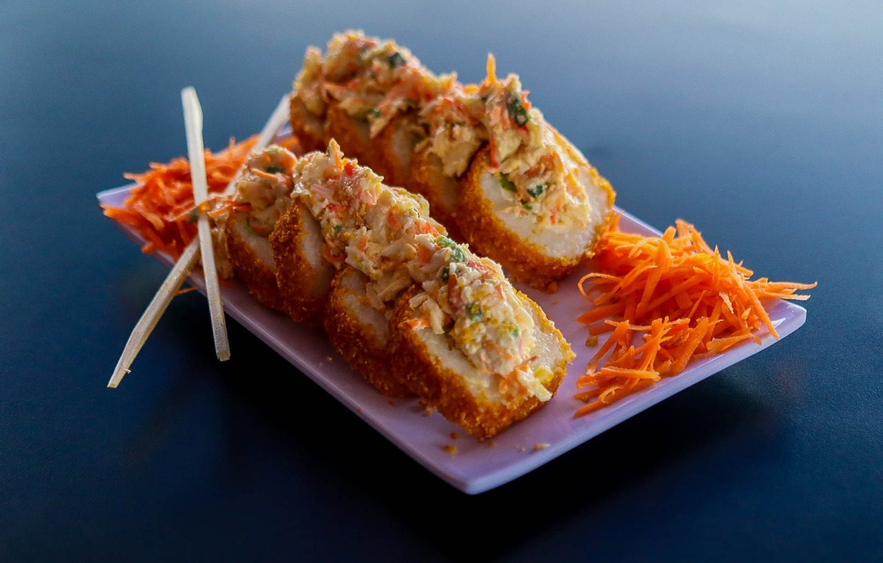 Tortilla frita rellena de philadelphia y camarón.