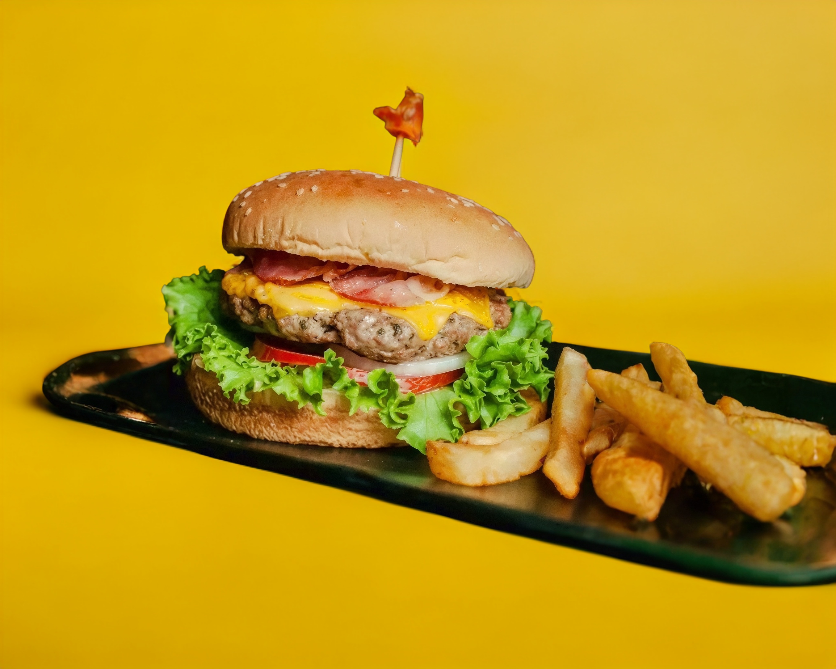 Mayonesa, cama de lechuga, carne de res, queso amarillo, tomate, cebolla y tocino y papas ala francesa.