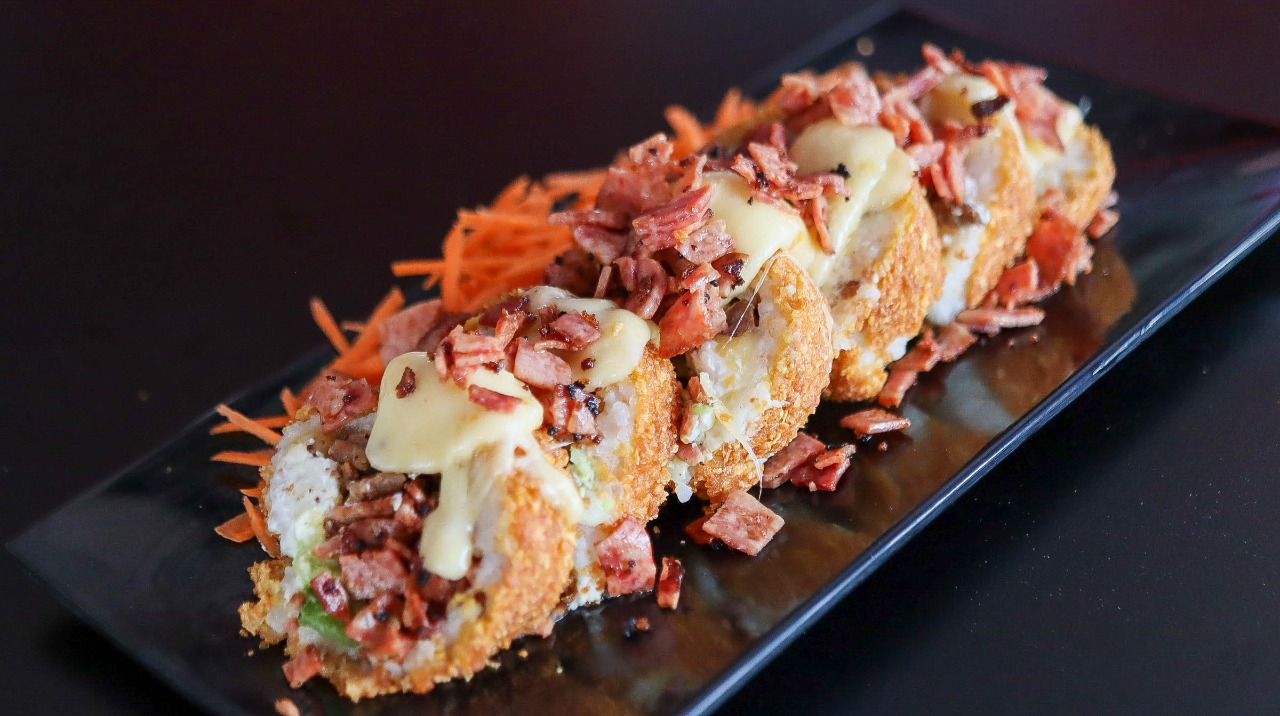 Aguacate, philadelphia, tocino, res, jalapeño, queso fundido y tocino por fuera.