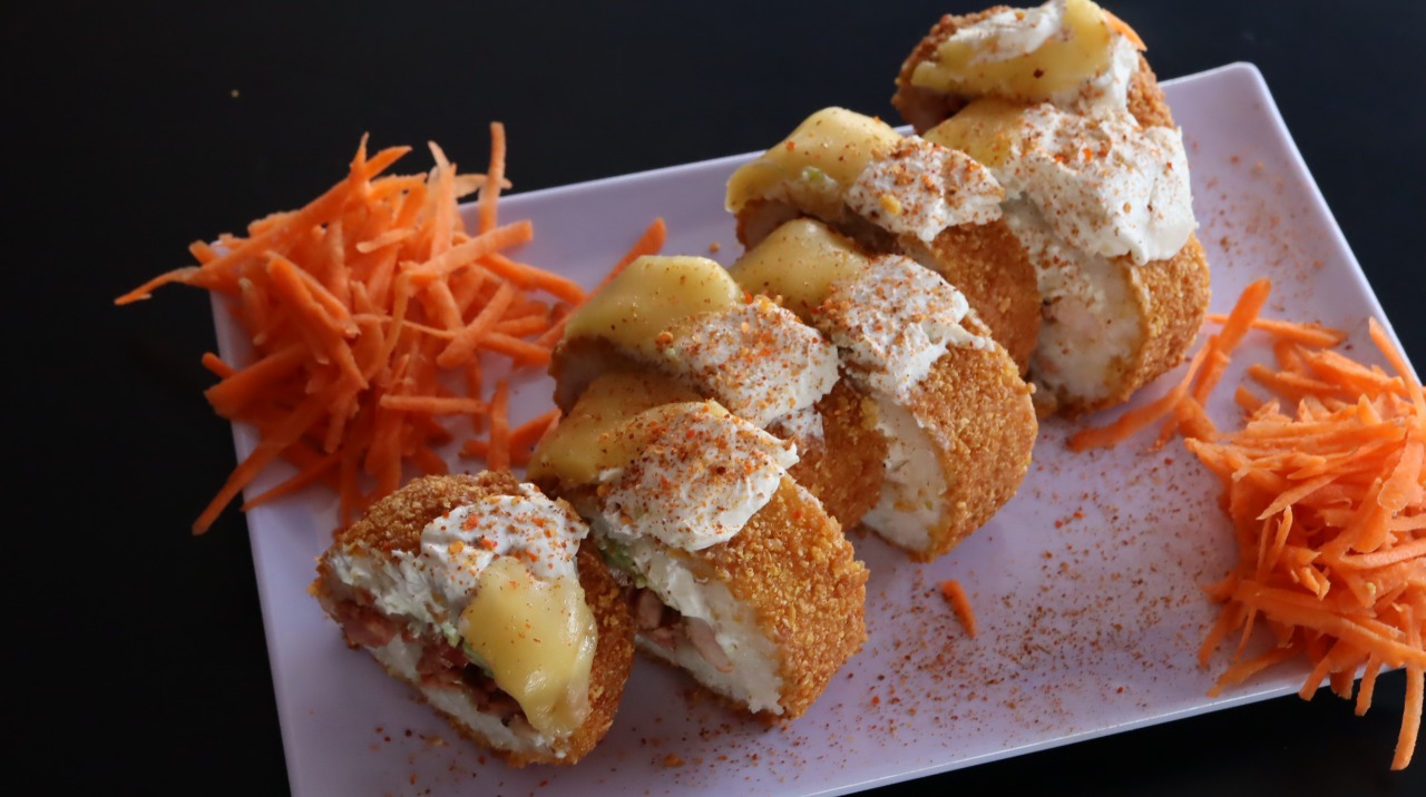 Aguacate, philadelphia, camarón, carne, por fuera queso gratinado espolvoreado con cheetos flaming hot.