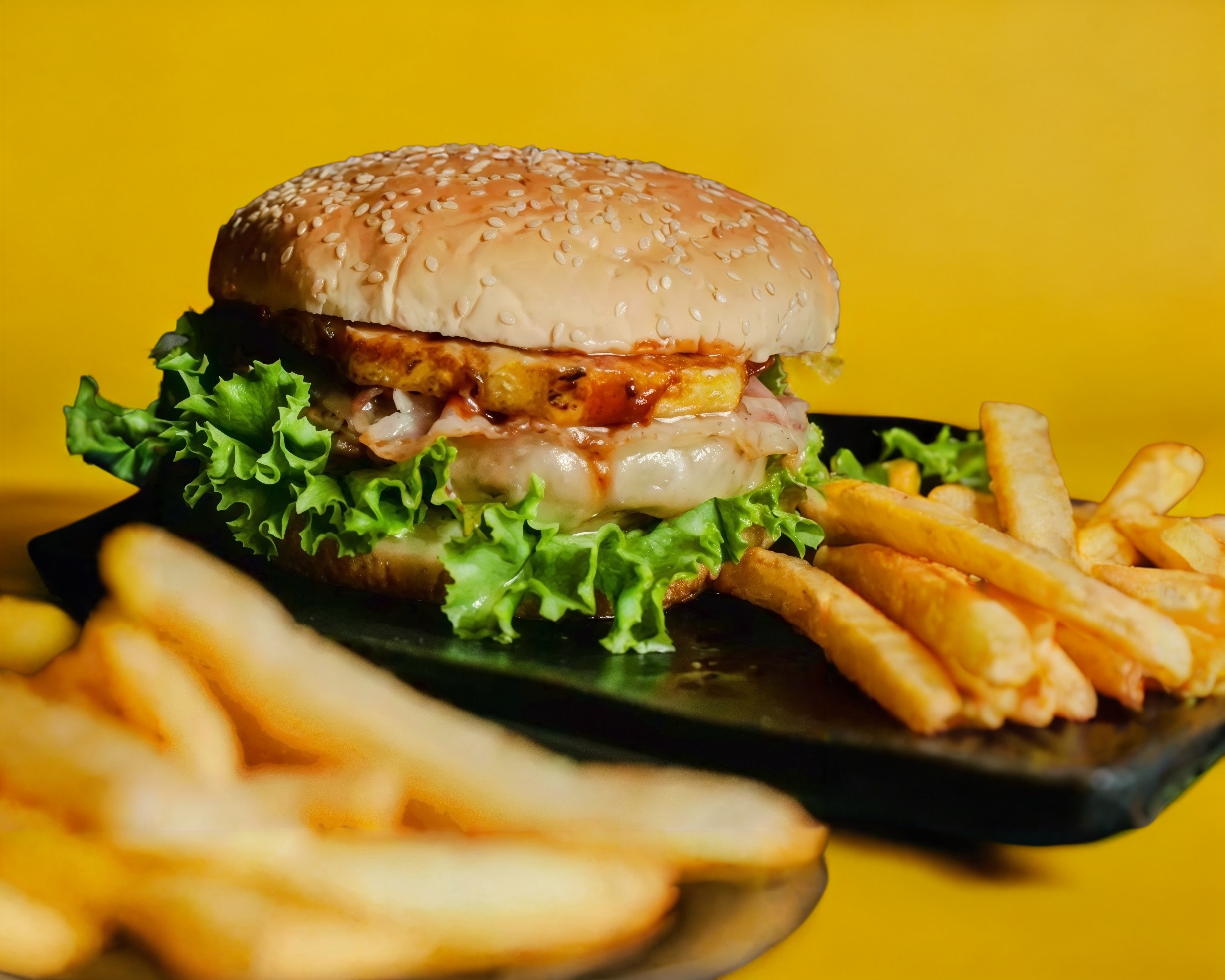 Mayonesa, cama de lechuga, carne de res, queso manchego, rodaja de piña, tocino en tiras y salsa BBQ y papas a la francesa.