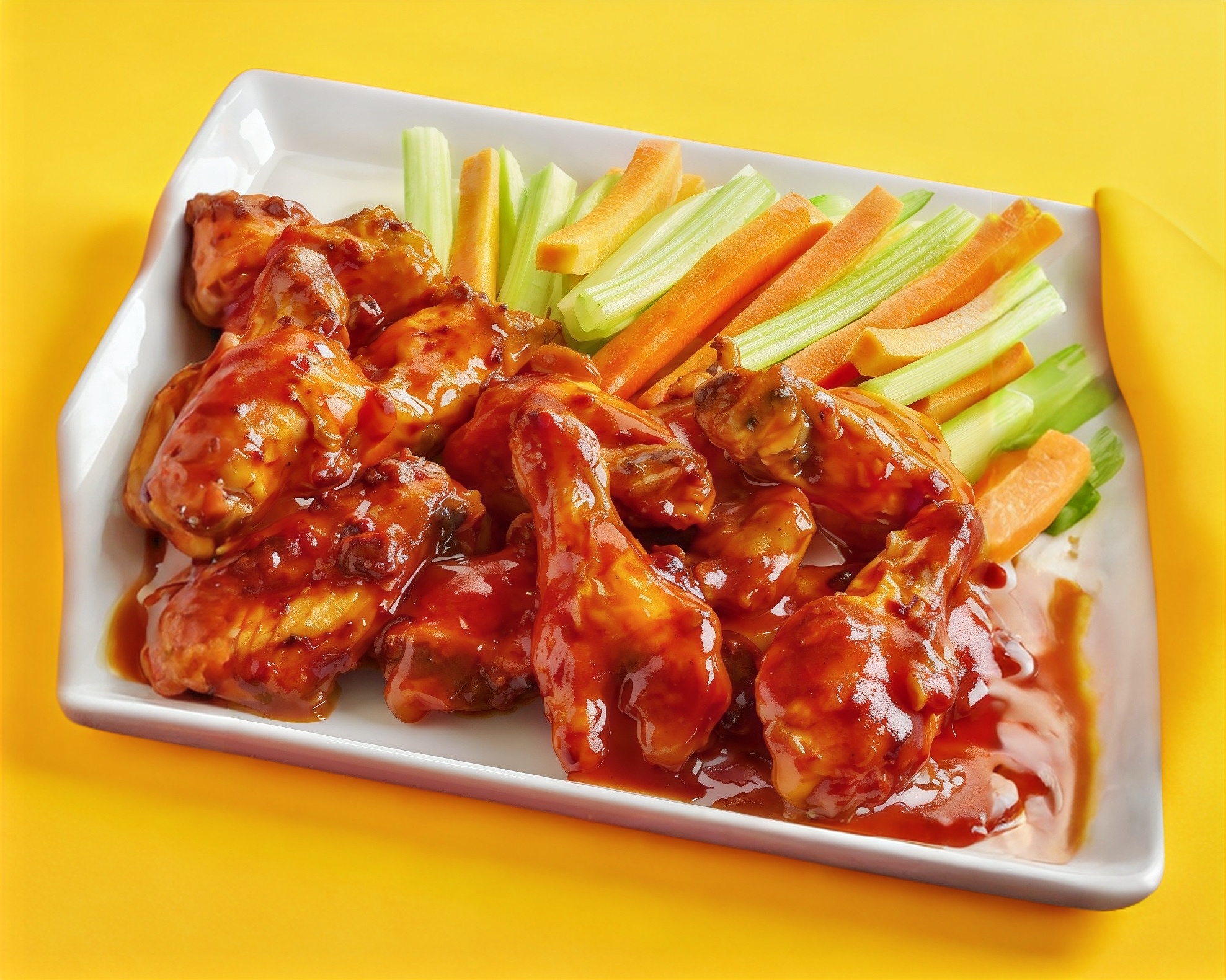 Base de tostitos, boneless en salsa, trocitos de apio y zanahoria.