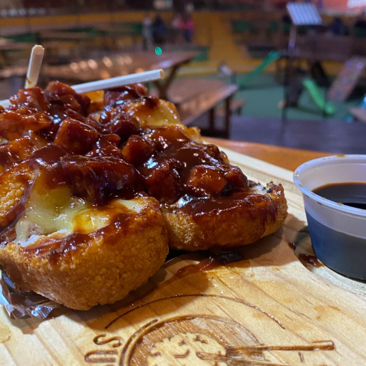 Rollo con Carne y tocino por dentro, queso gratinado, hojuelas de cebolla frita y bañado en BBQ por fuera.