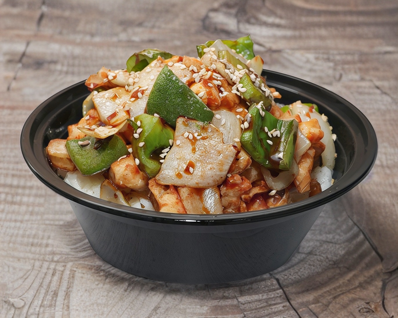 Cama de arroz blanco, pimientos verdes, cebolla blanca y pollo capeado bañado en salsa teriyaki con ajonjolí.