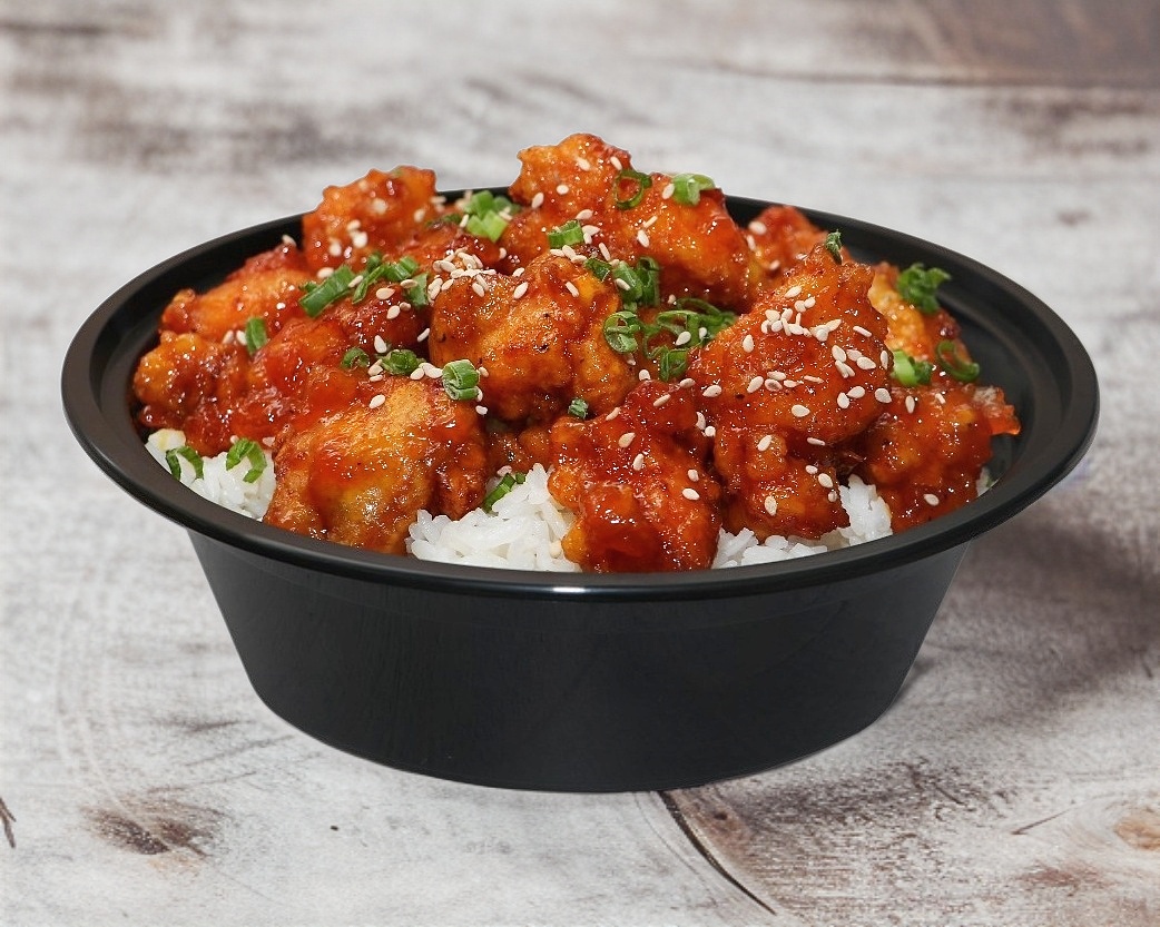 Cama de arroz blanco, pollo capeado en salsa de naranja con ajonjolí y cebollin.
