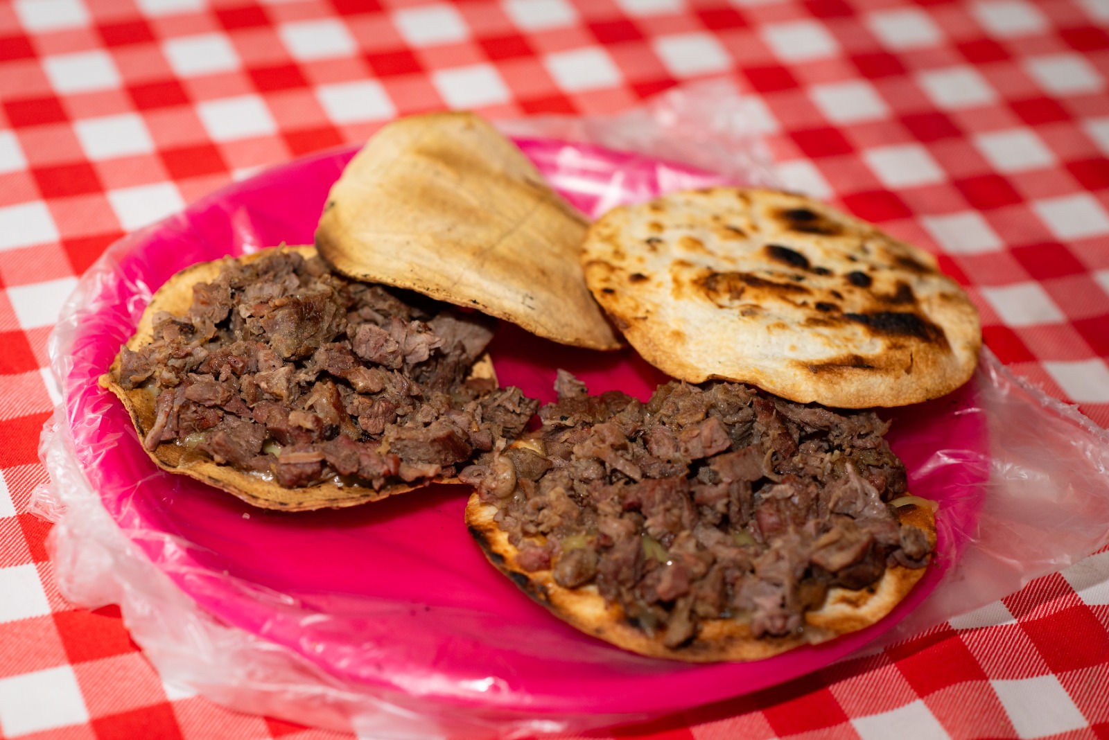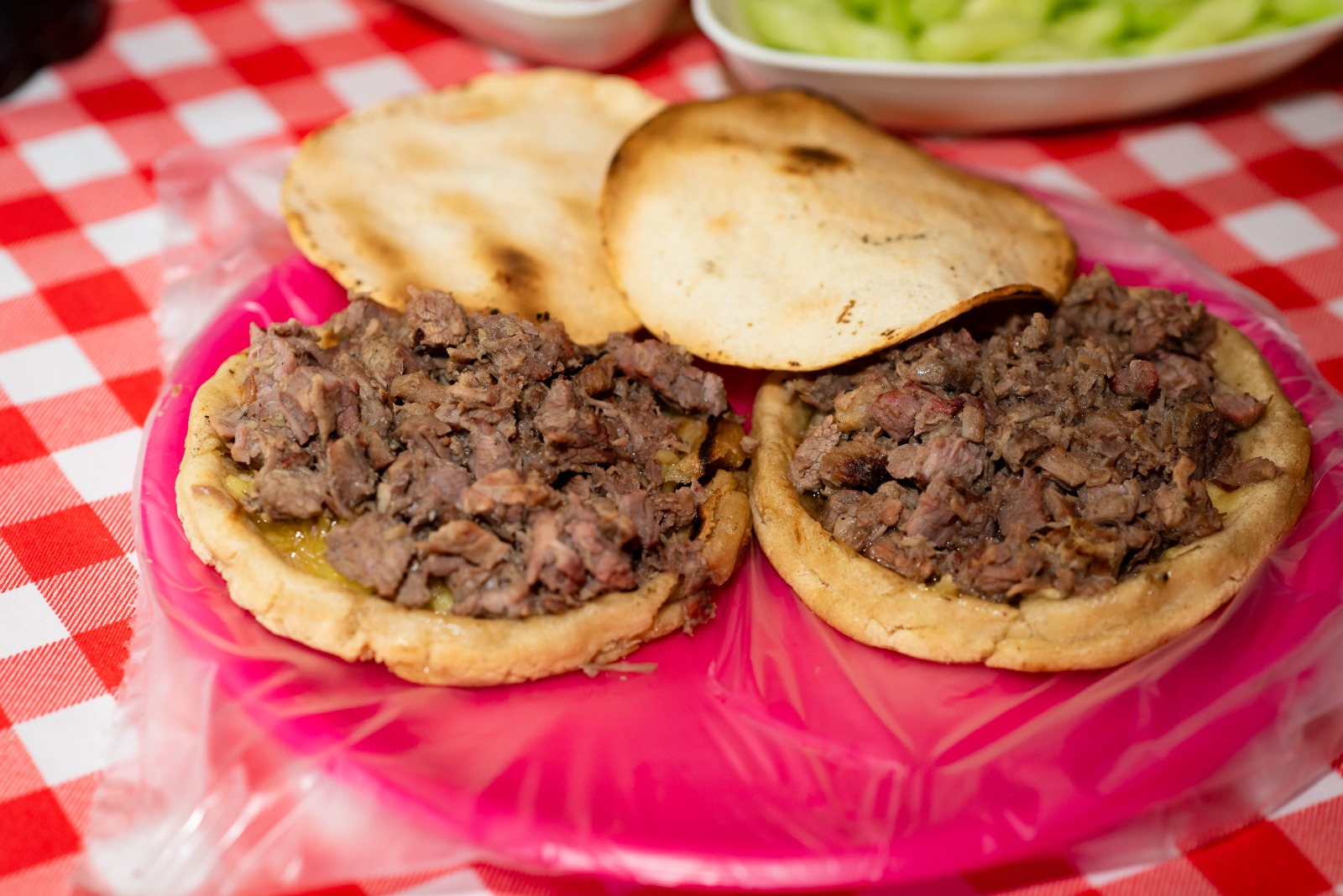 Gordita de maseca, asientos, queso asadero gratinado y carne asada. Incluye salsa, guacamole y verdura.