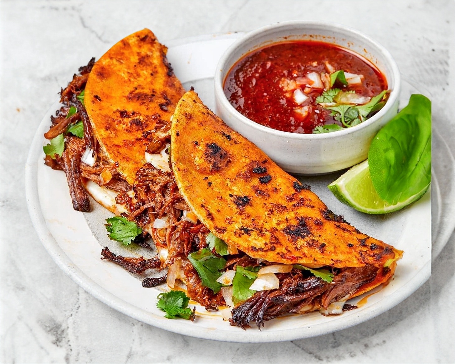 Quesabirria dorada de tortillas de Maseca acompañado de su consomé con un agua de sabor de la casa