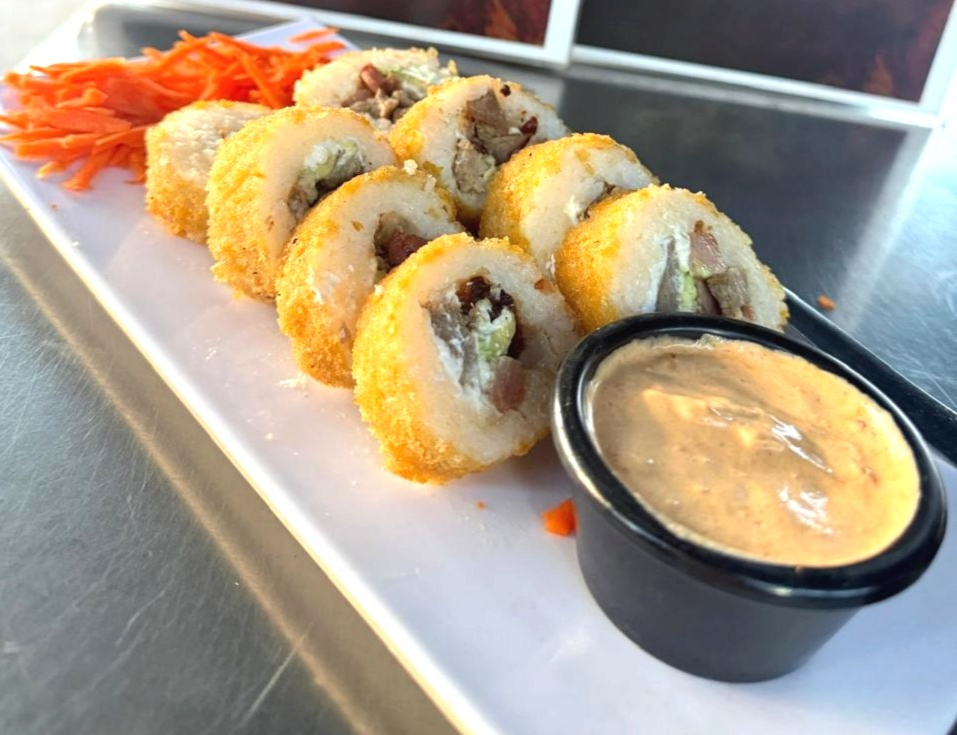 Philadelphia, aguacate, carne asada, tocino y chile toreado por fuera