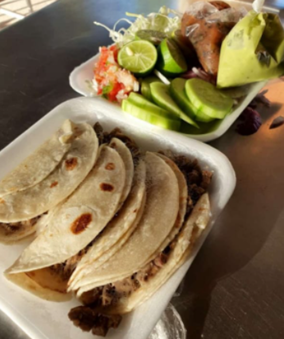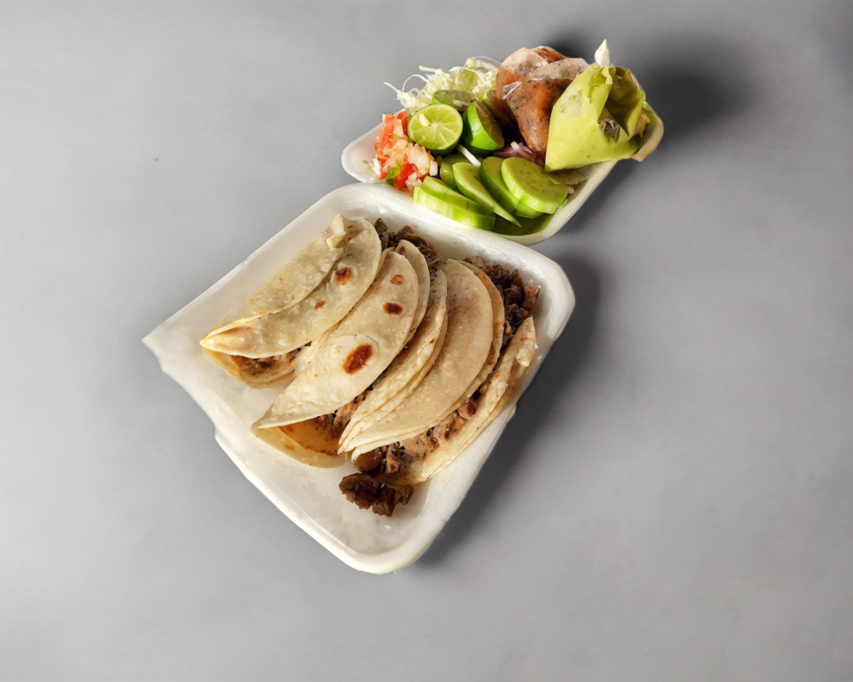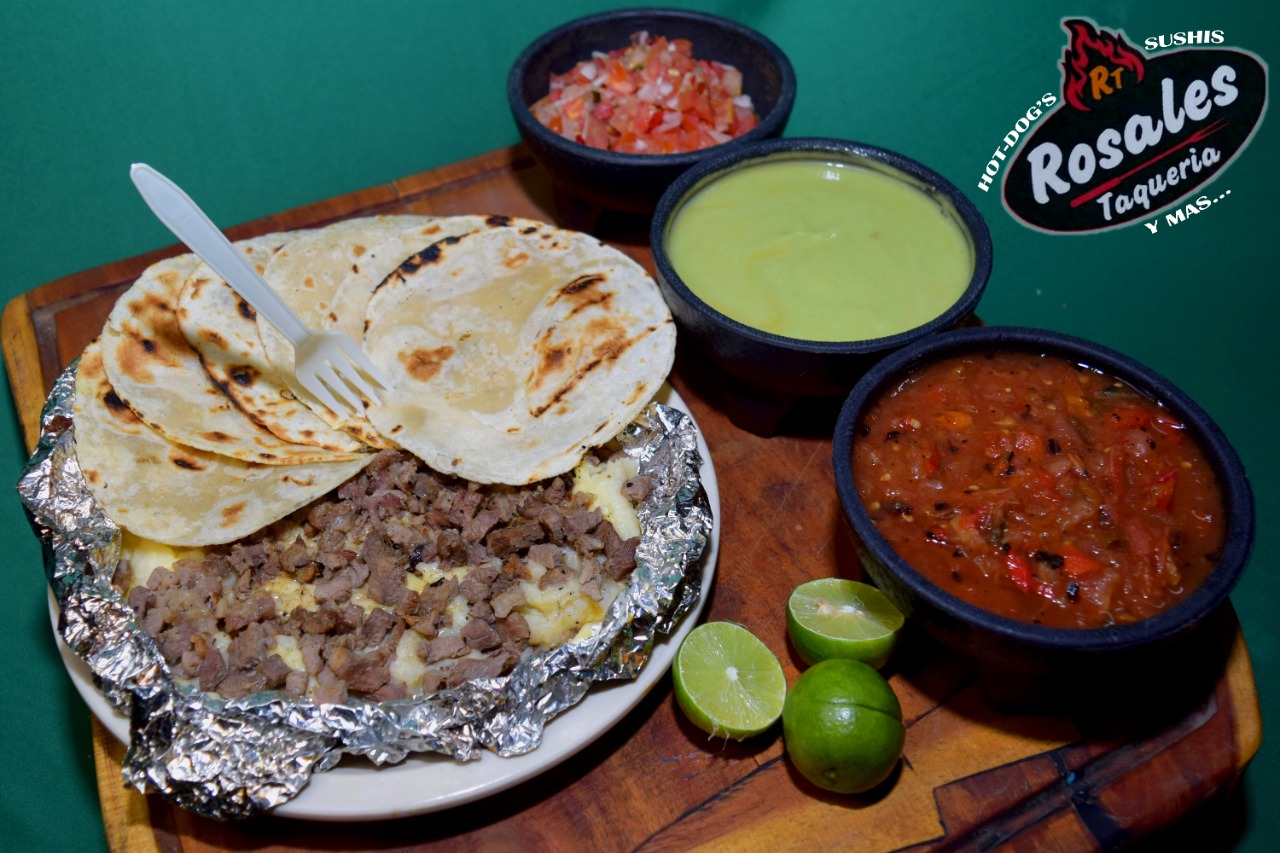 Pure de papa, queso asadero, tortilla de harina y de maíz, limones repollo cebolla morada aguacate salsa