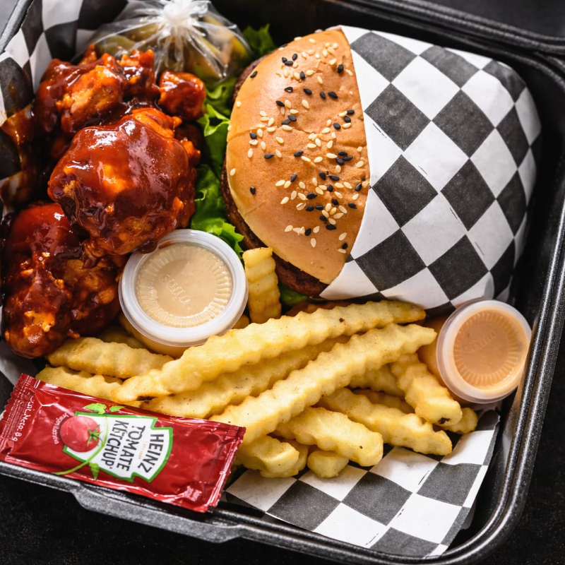 Hamburguesa clásica, 120 gr de boneless en la salsa de tu elección, 120gr de papas fritas y 1 refresco coca-cola 450ml. Incluye 1 aderezo ranch, 1 aderezo queso-chiplote.