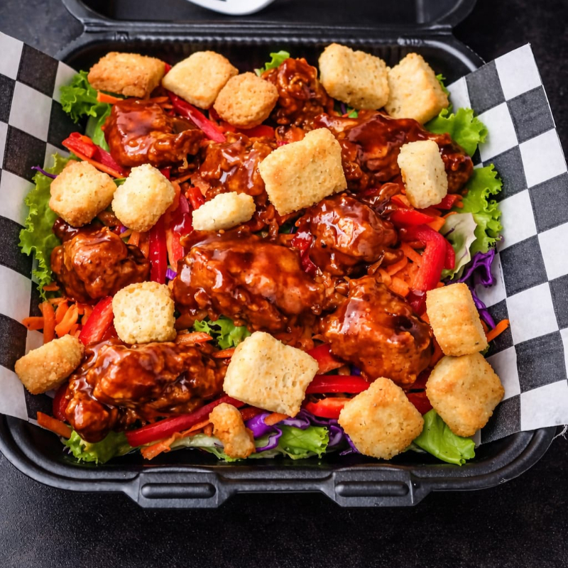 Base de lechuga franciscana, col morada, pimientos, zanahoria, crutones y boneless en la salsa de tu elección. Incluye 1 aderezo