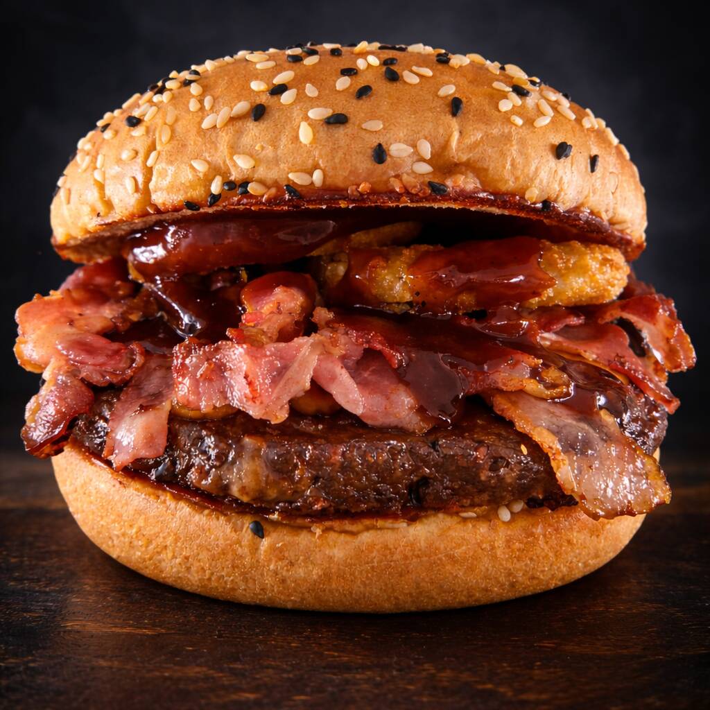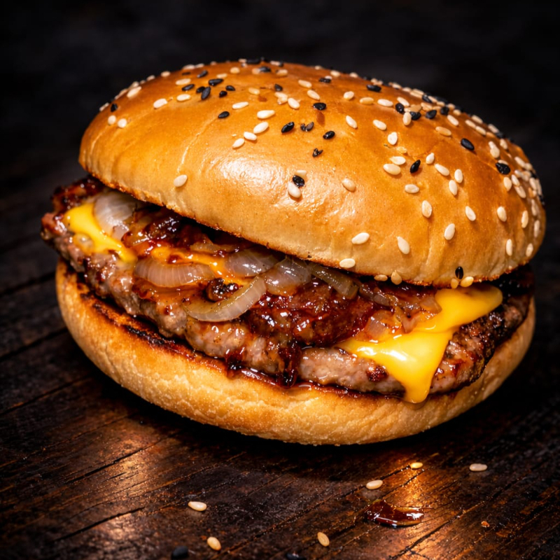 Pan, carne, queso americano, cebolla caramelizada con tocino, salsa bbq y papas fritas.