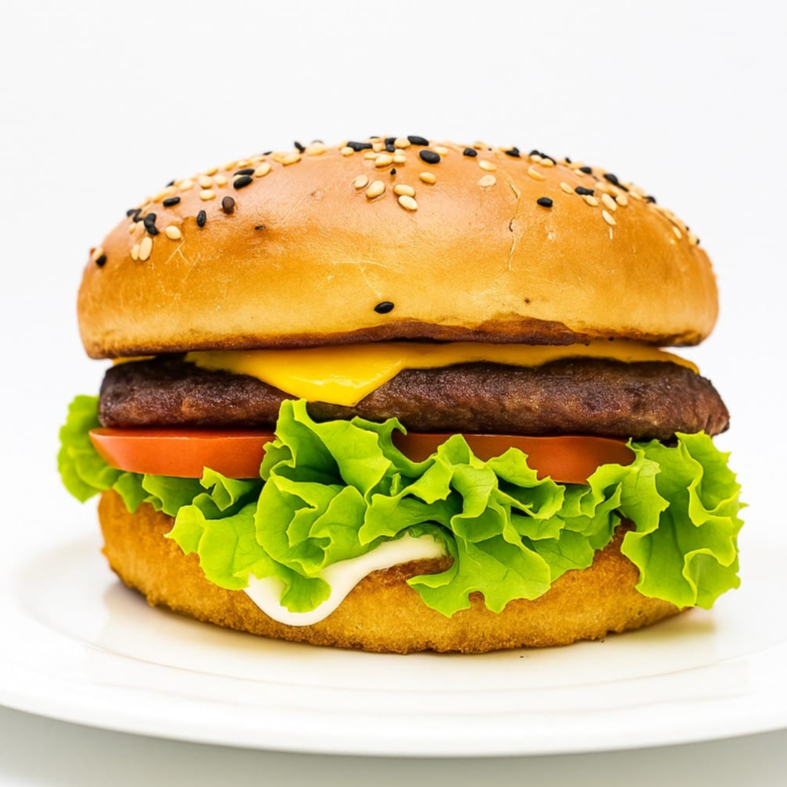 Pan, carne, queso americano, lechuga franciscana, tomate, aderezo y papas fritas.