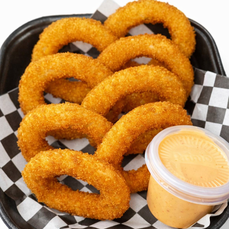 Pan, carne, queso americano, tiras de tocino, aros de cebolla, salsa bbq y papas fritas.