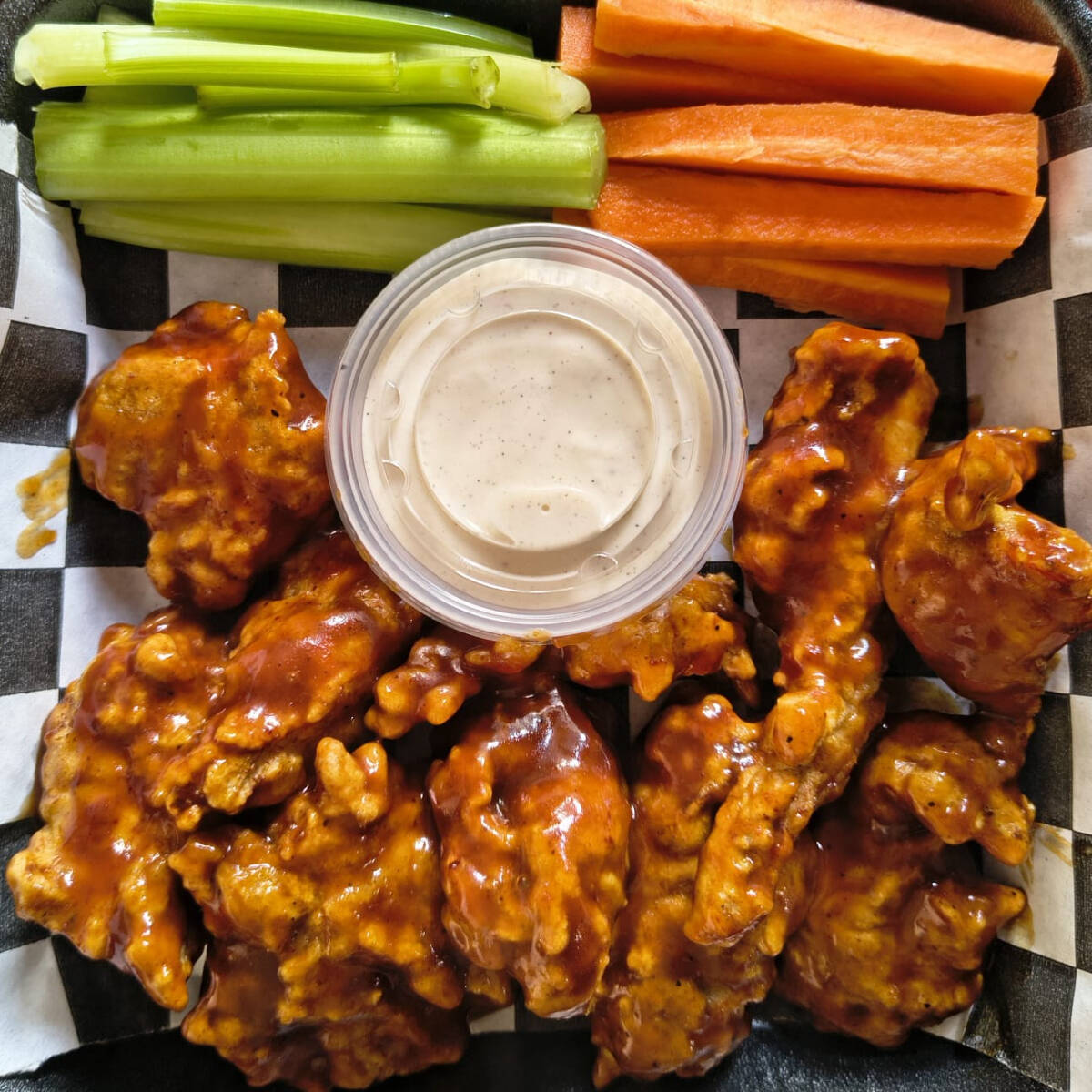 300gr de trozos de pollo empanizados, bañados en la salsa de tu elección acompañados de zanahoria y apio. Incluye 1 aderezo ranch.