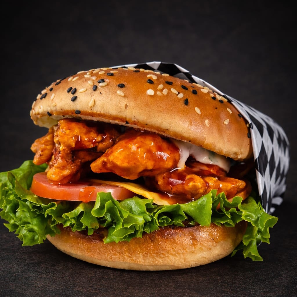 Pan, 120gr de boneless en la salsa de tu elección, queso americano, lechuga franciscana, tomate, aderezo ranch y papas fritas.