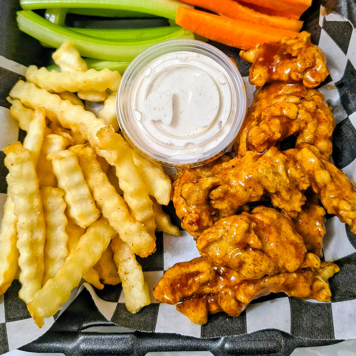 200gr de trozos de pollo empanizados, bañados en la salsa de tu elección acompañados de zanahoria y apio. Incluye 1 aderezo ranch.