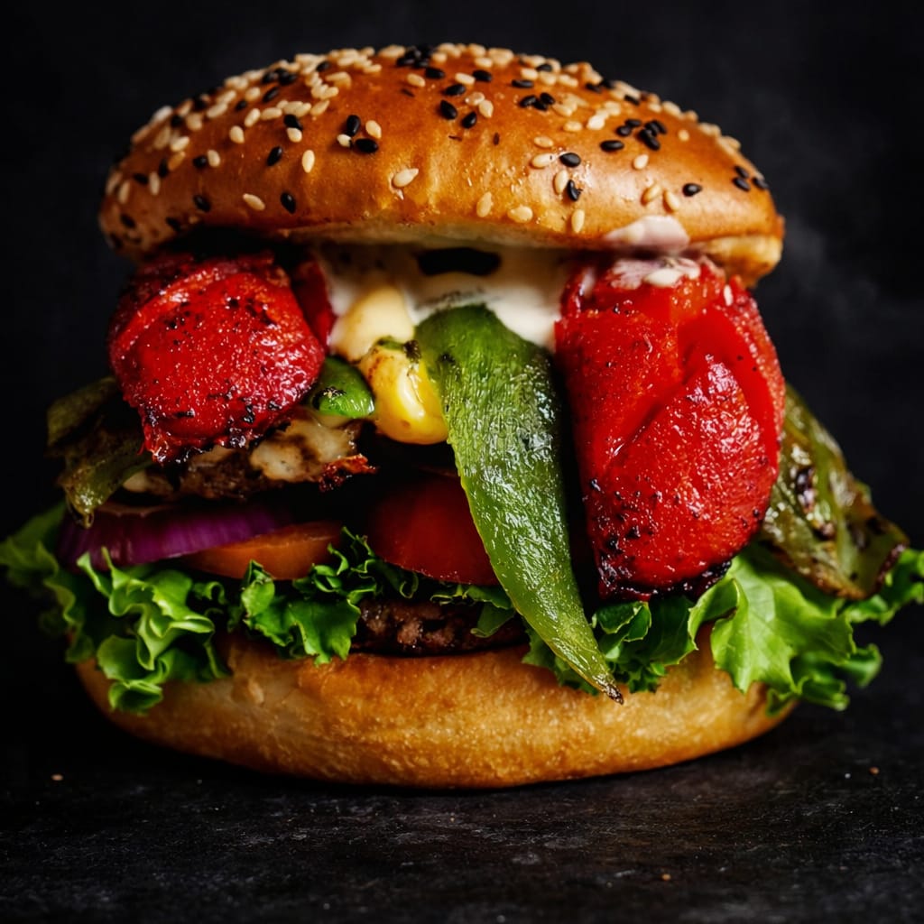 Pan, carne, queso americano, queso manchego, tiras de tocino, chile rescoldado, salchicha asada, lechuga franciscana, tomate, cebolla morada, aderezo y papas fritas.