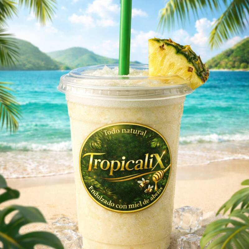 Piña colada natural, elaborada con jugo de piña, crema de coco, hielo y endulzado al gusto con miel de abejas.