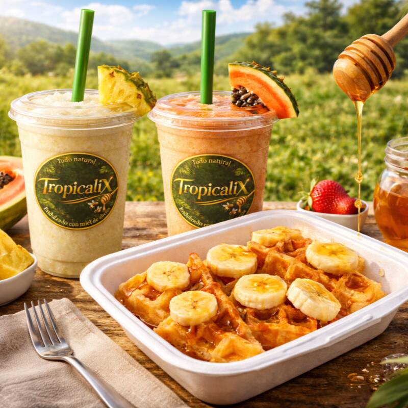 Piña colada o licuado de papaya con waffles de avena