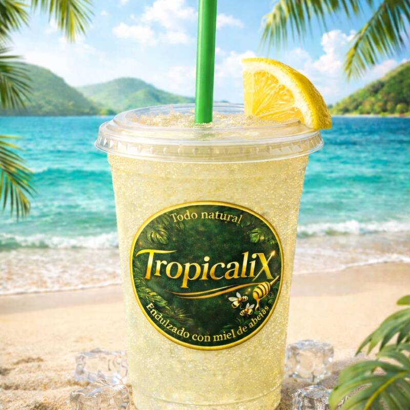 Limonada fresca natural, elaborado con limón, hielo, y endulzado al gusto con miel de abejas.