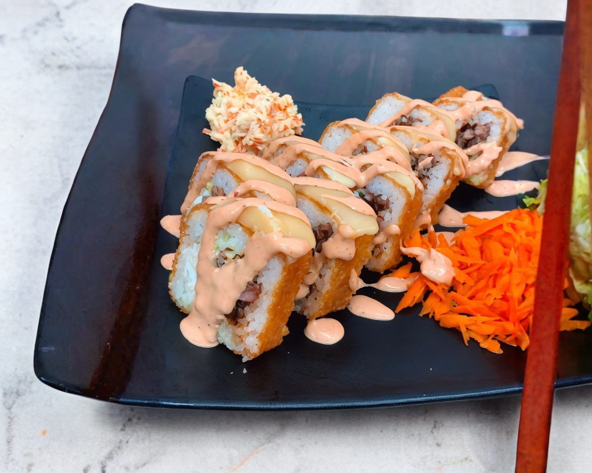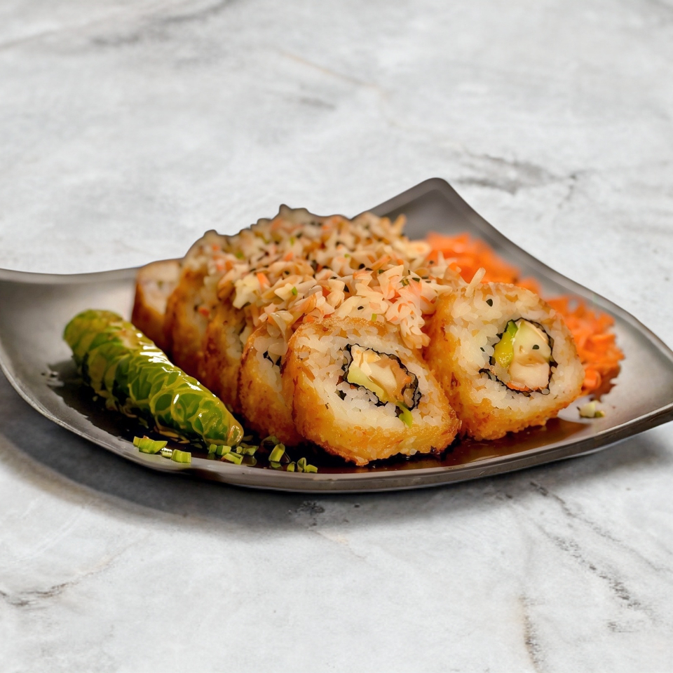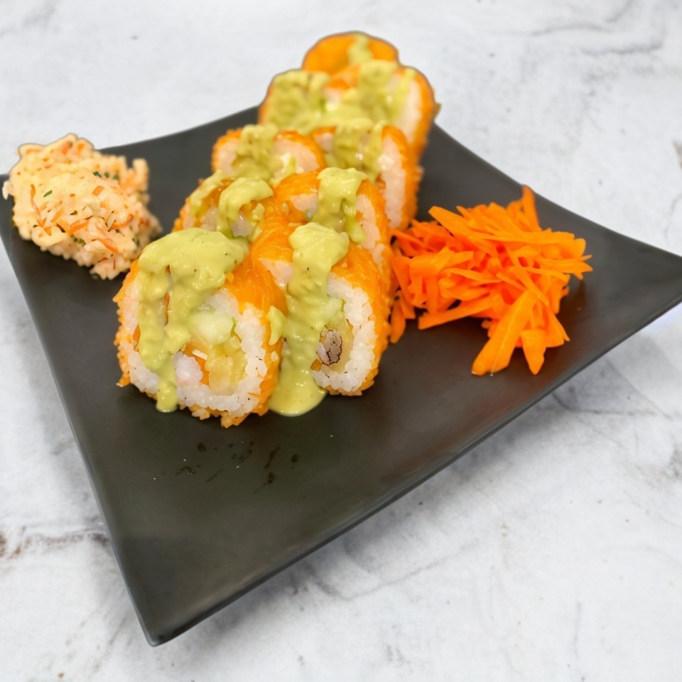 XD: Camarón empanizado y cebolla asada. XF: Salsa de jalapeño. Base de aguacate, pepino, queso crema y alga.
