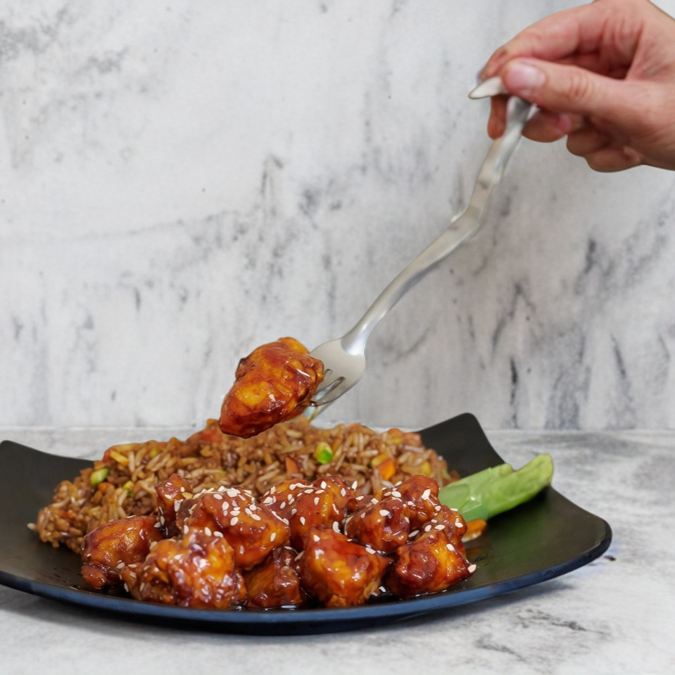 Cama de arroz cantones, pollo capeado y bañado en salsa teriyaki spicy.