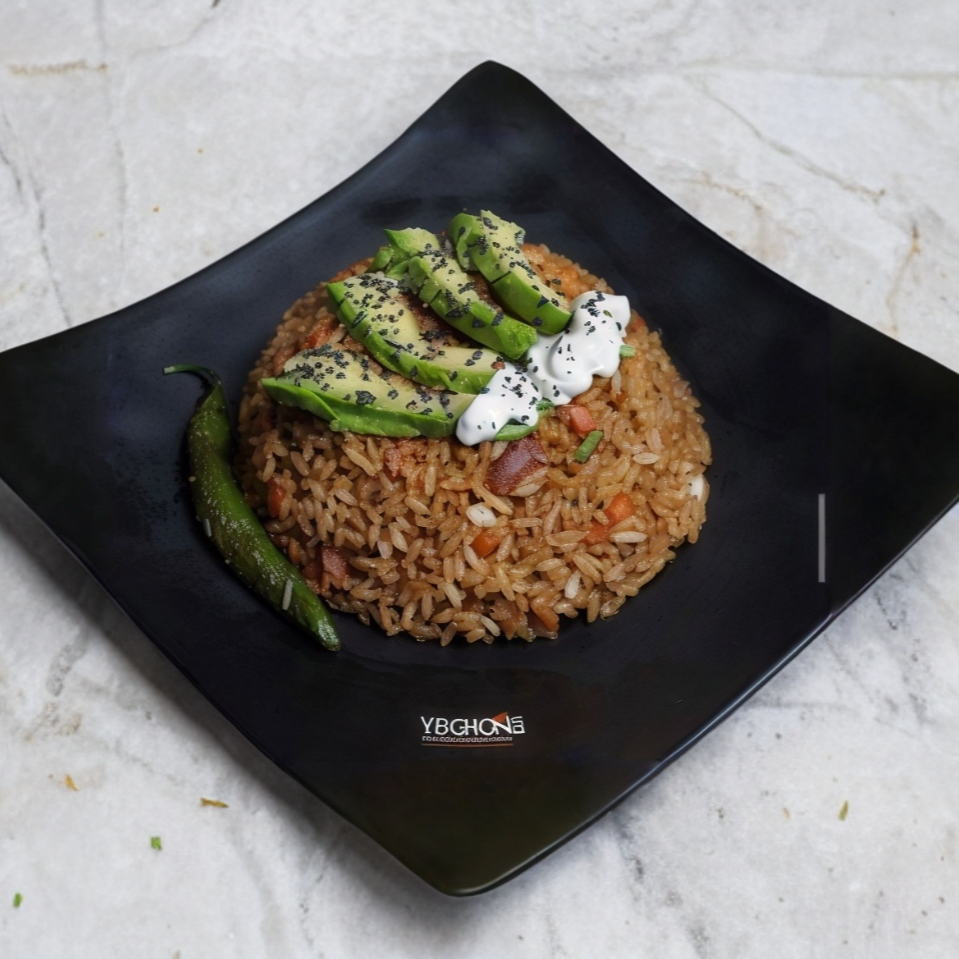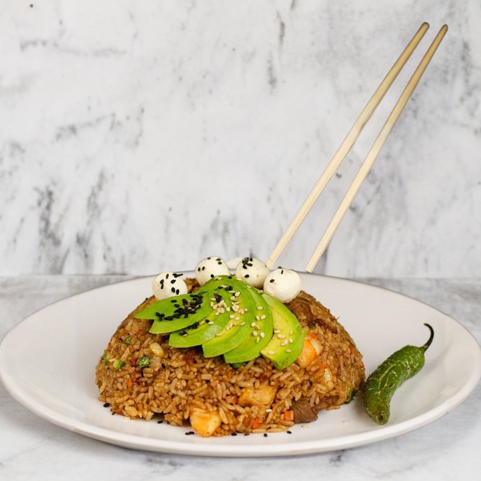 Arroz frito con calabaza, zanahoria y tocino; decorado con aguacate, trozos de queso crema y ajonjolí.