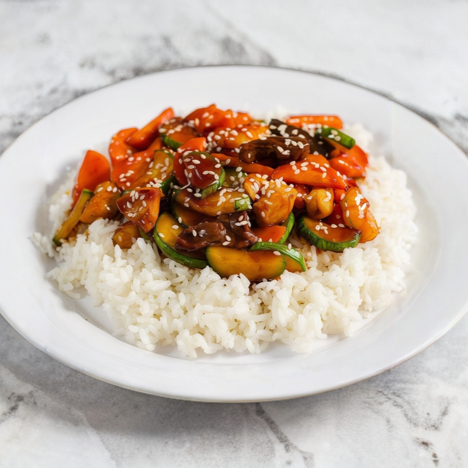 Cama de arroz blanco, guisado de calabaza, zanahoria y proteína; bañado en nuestra salsa teriyaki especial.
