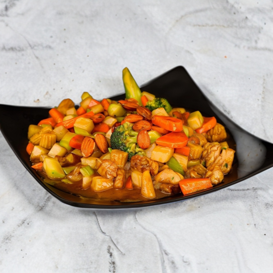 Media orden. Pollo con zanahoria, apio, brócoli, jícama, elote y almendras; guisado en salsa dulce de la casa.