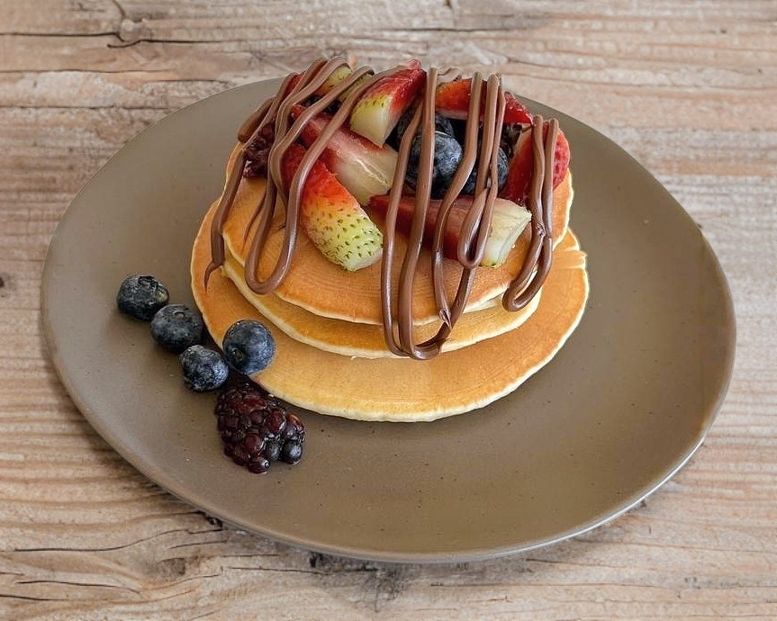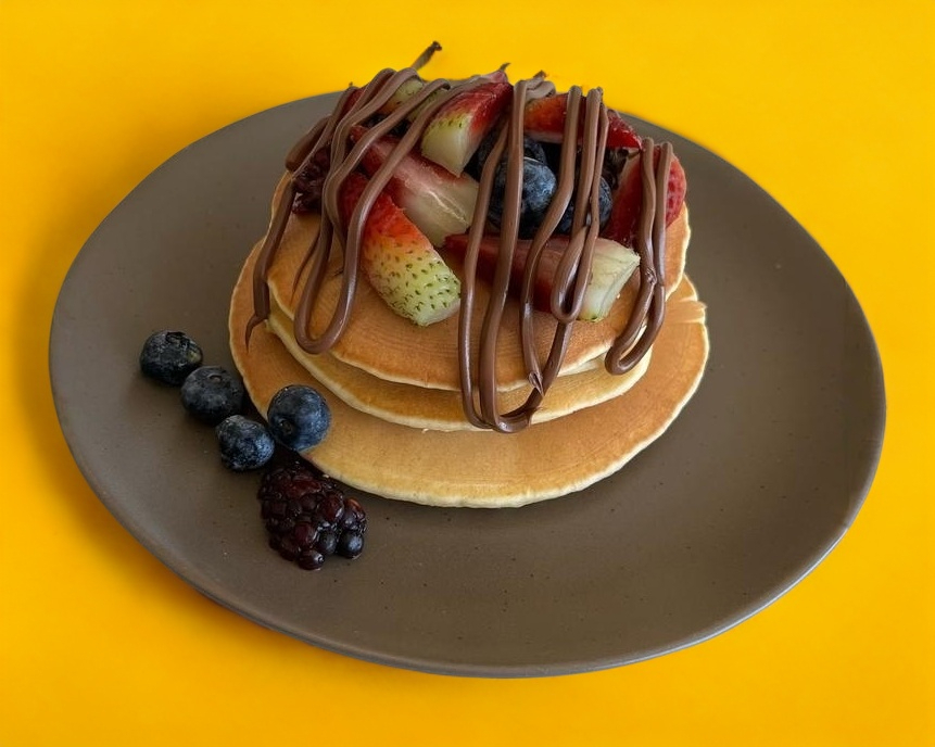 4 hotcakes con 3 toppings a elegir