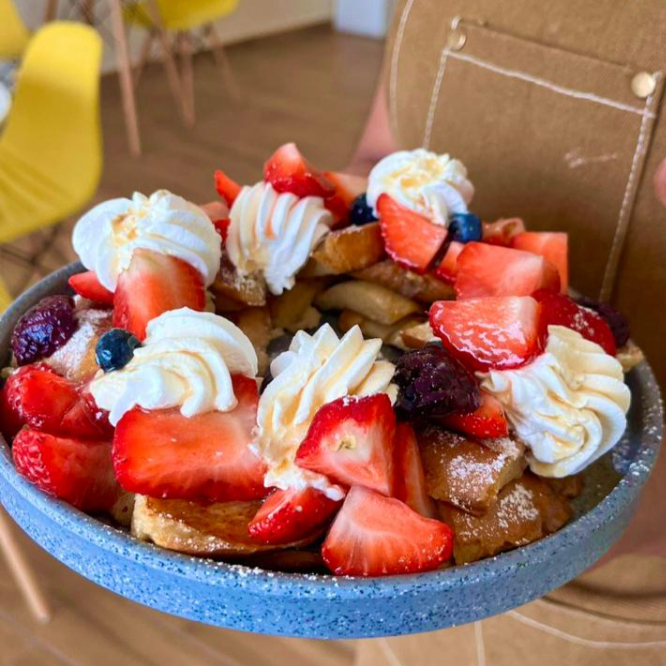 Pan brioche preparado acompañado de plátano o fresa,crema batida,miel y azúcar glas