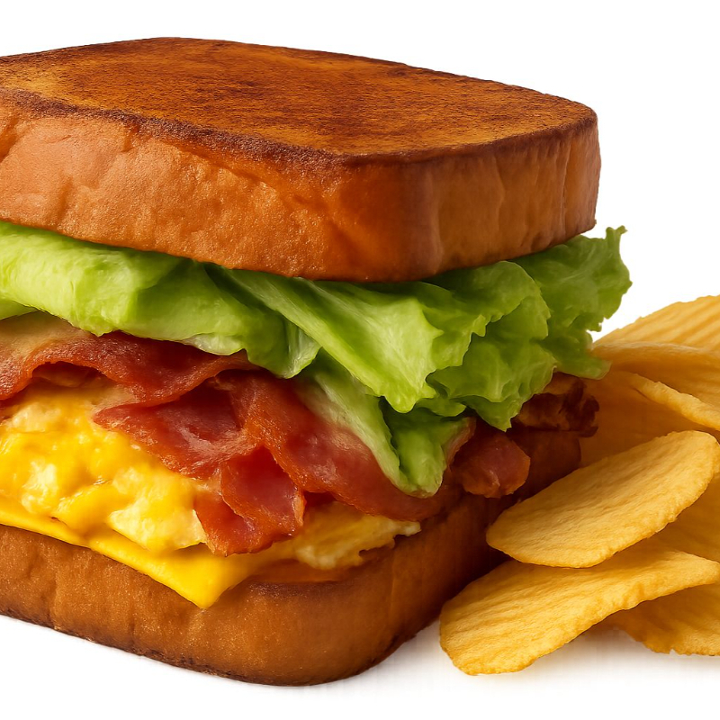 Pan Brioche con tocino,queso gouda,huevo,lechuga, jamón,queso americano y aderezo. Acompañado de chips y jalapeños