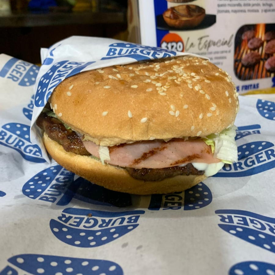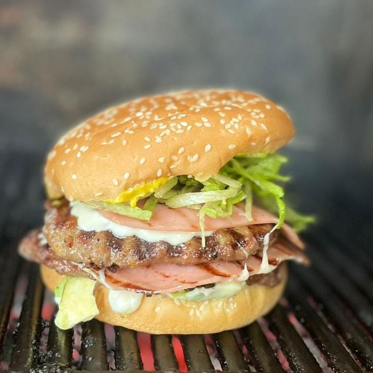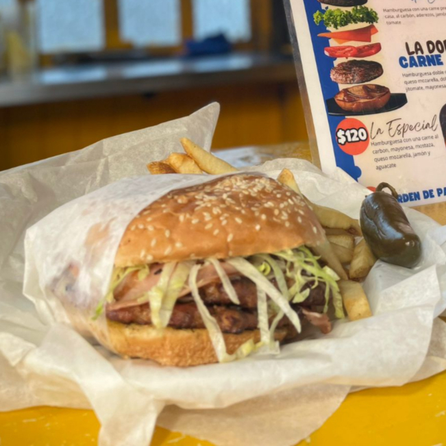 hamburguesa con doble carne ,doble queso mozarella, doble jamón, lechuga, jitomate, mayonesa, mostaza y aguacate