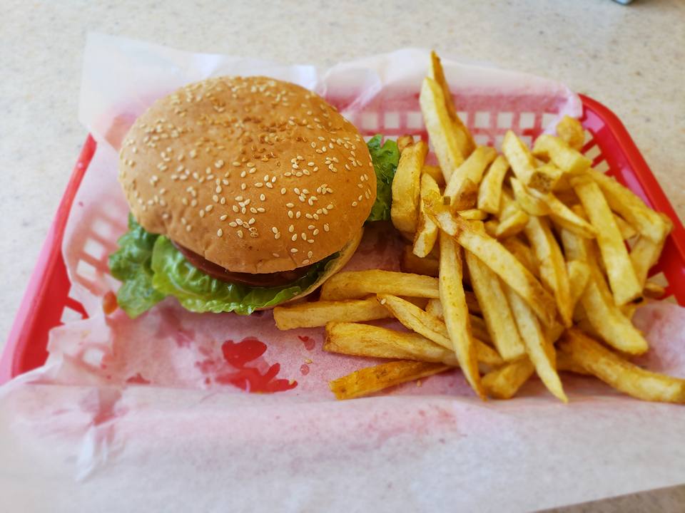 Hamburguesa sencilla con lechuga, tomate y cebolla acompañada con papas y refresco