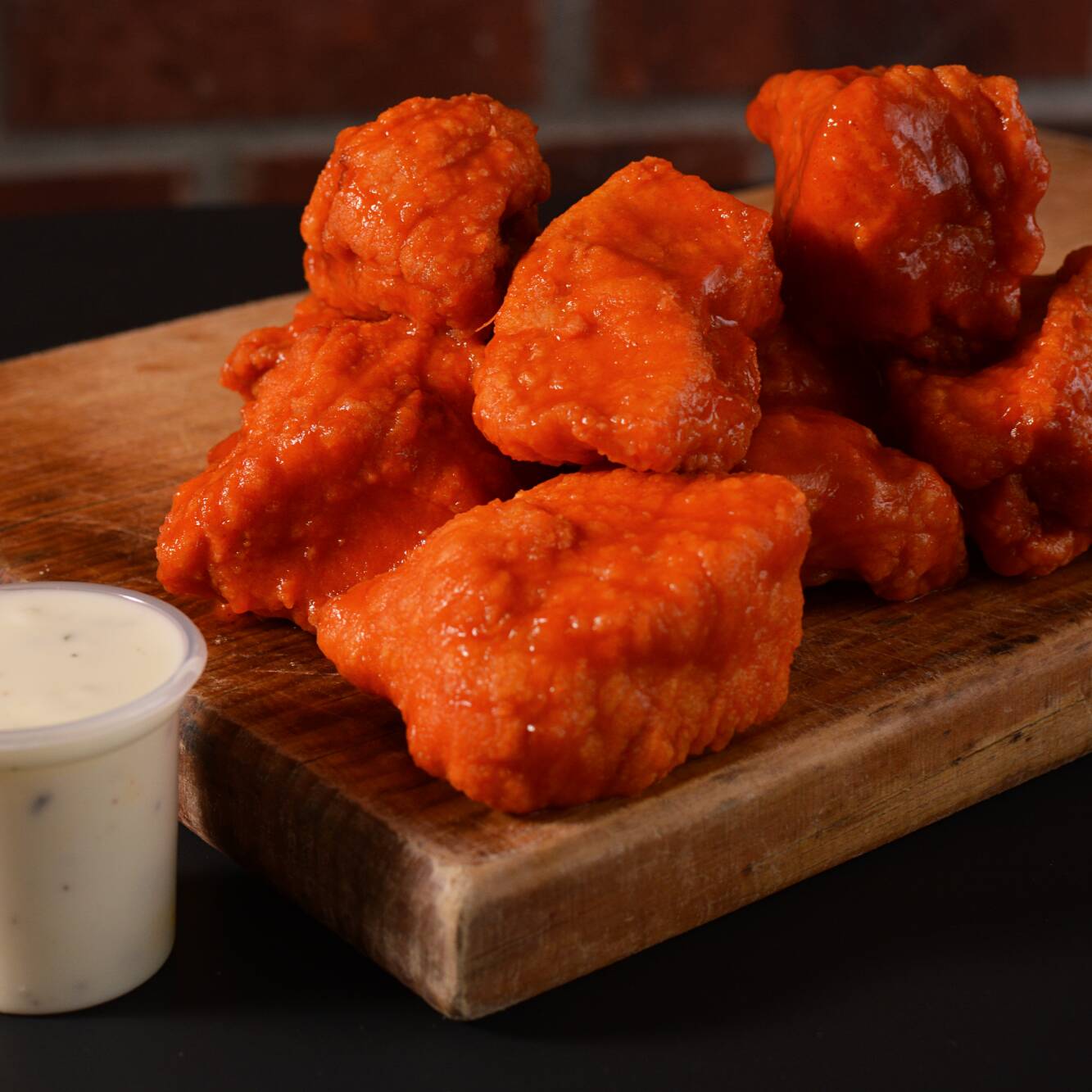 Boneless frescos preparados al momento acompañados con papas fritas y aderezo ranch.