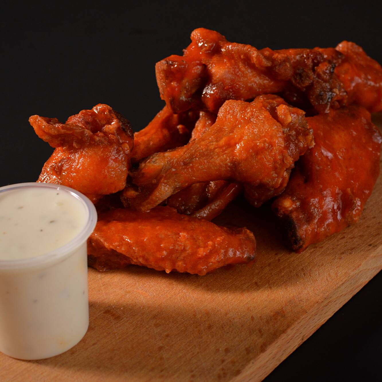 Alitas frescas preparadas al momento acompañados con papas fritas y aderezo ranch.