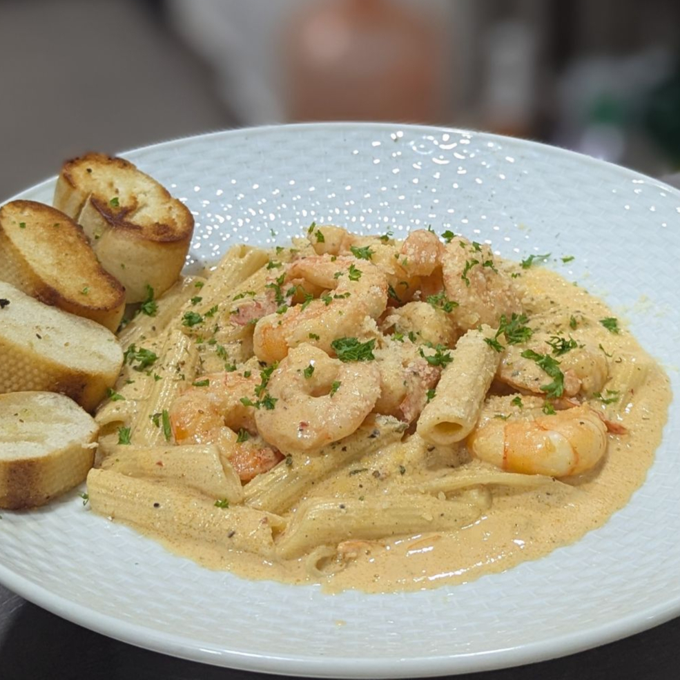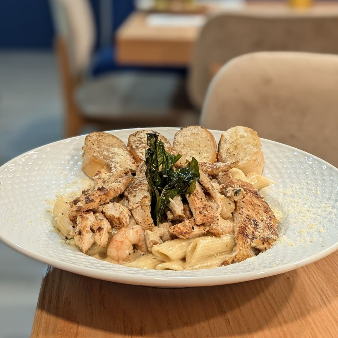 Pasta penne en crema de chipotle, acompañada de pechuga de pollo a las hierbas finas.