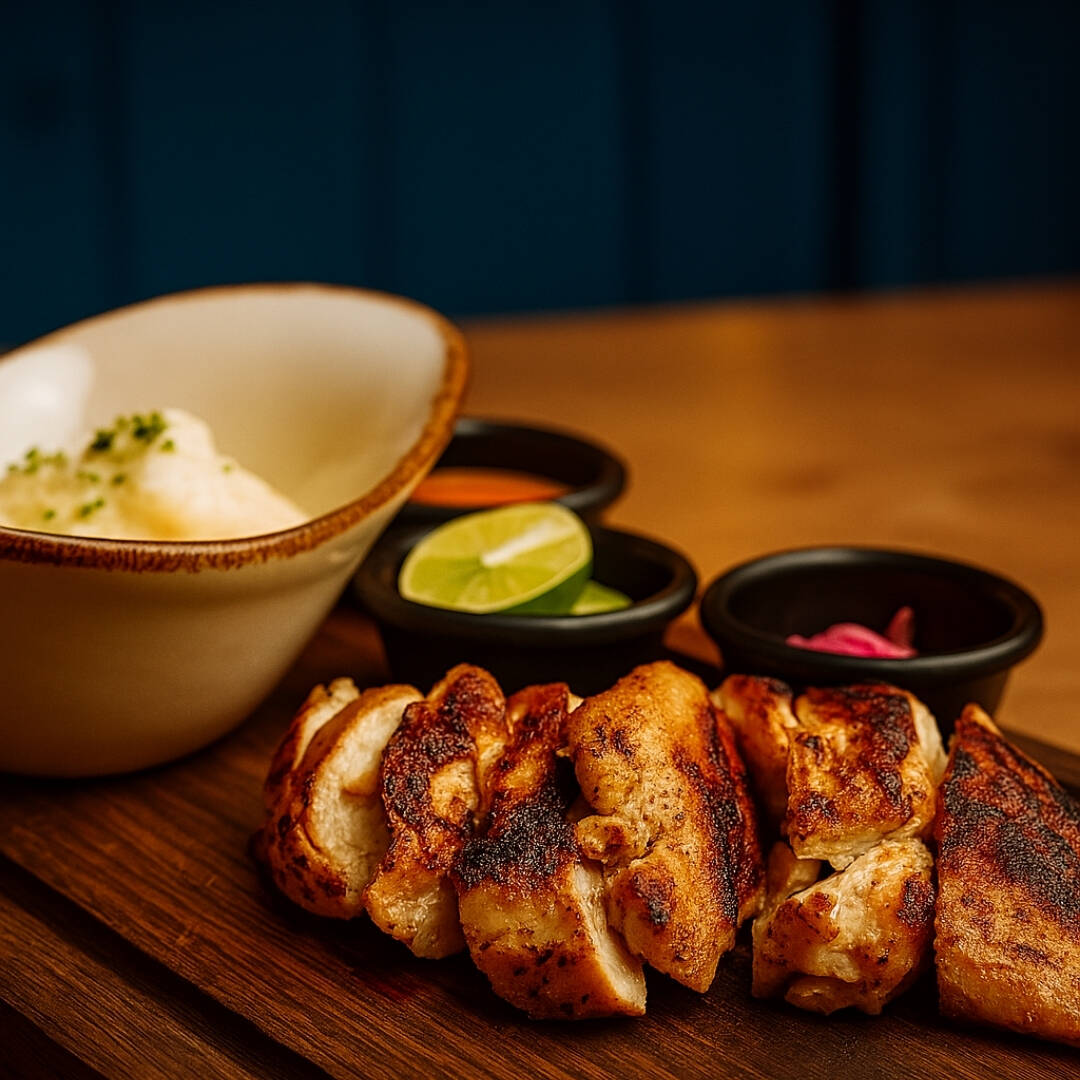 Jugosa pechuga de pollo sazonada y con un complemento a elegir.