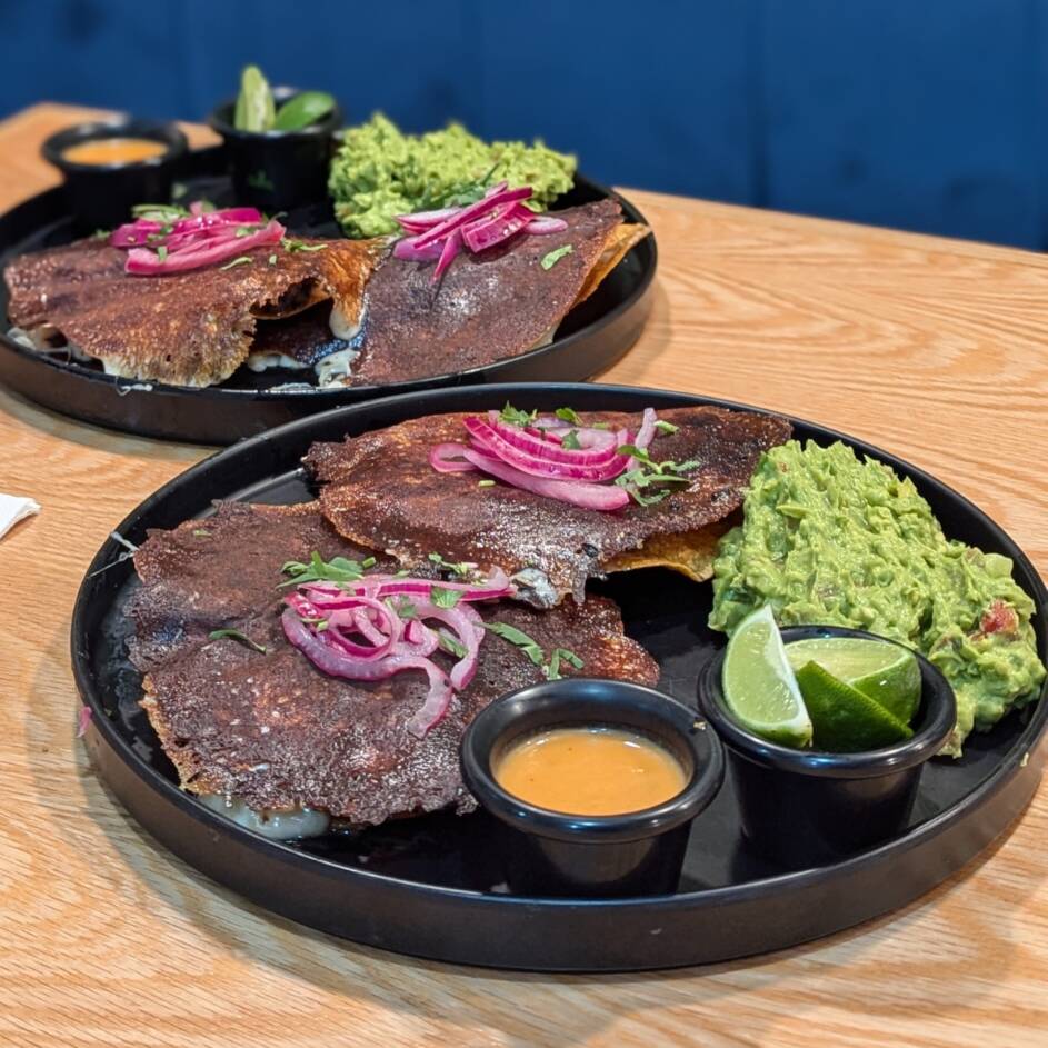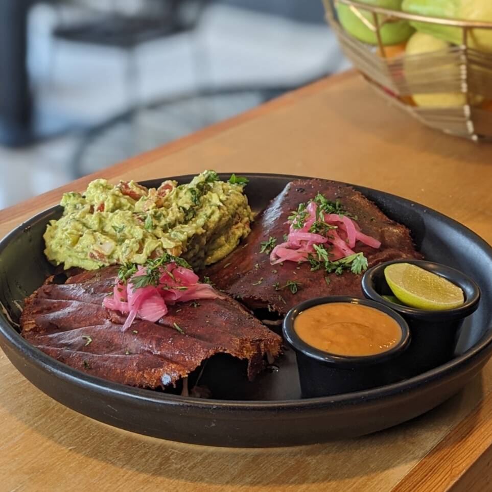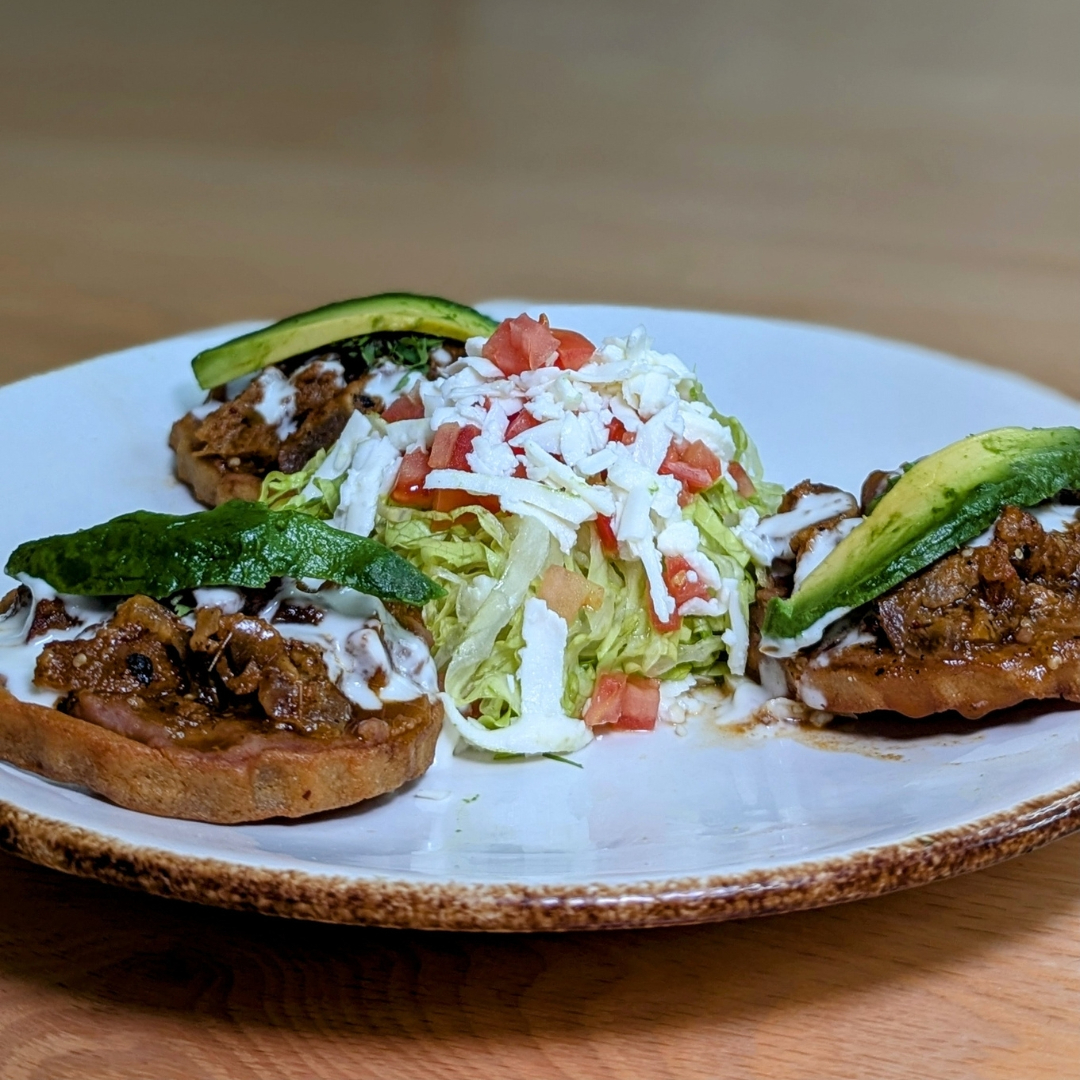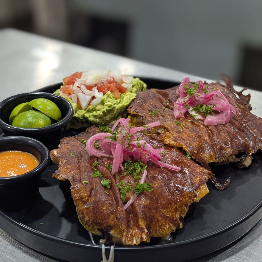 Dos tostadas de maíz con carne a elegir cubiertas en costra de queso asadero, acompañadas con guacamole y salsa de la casa.